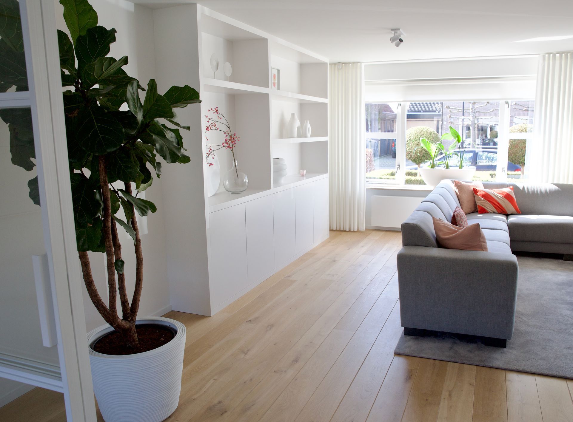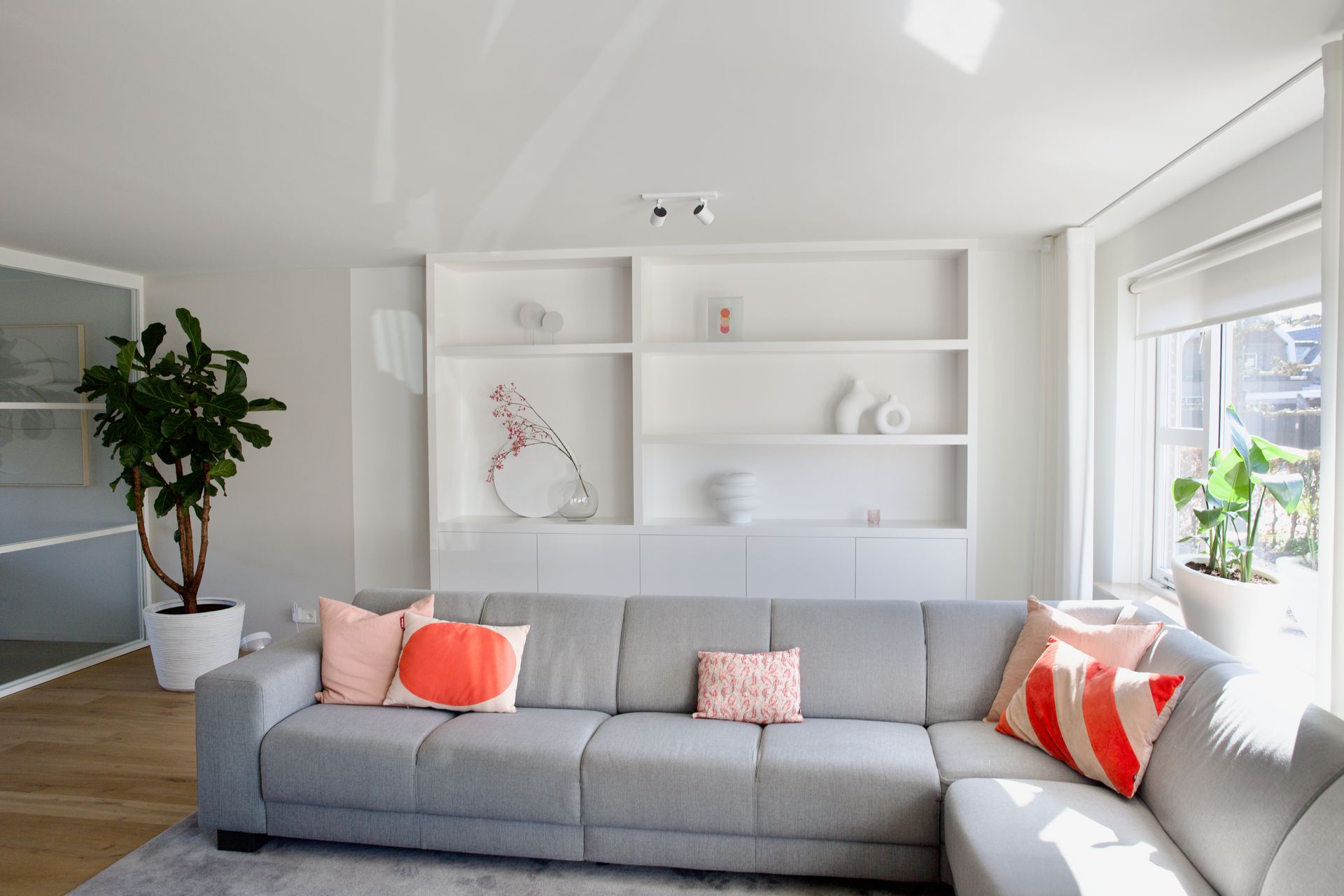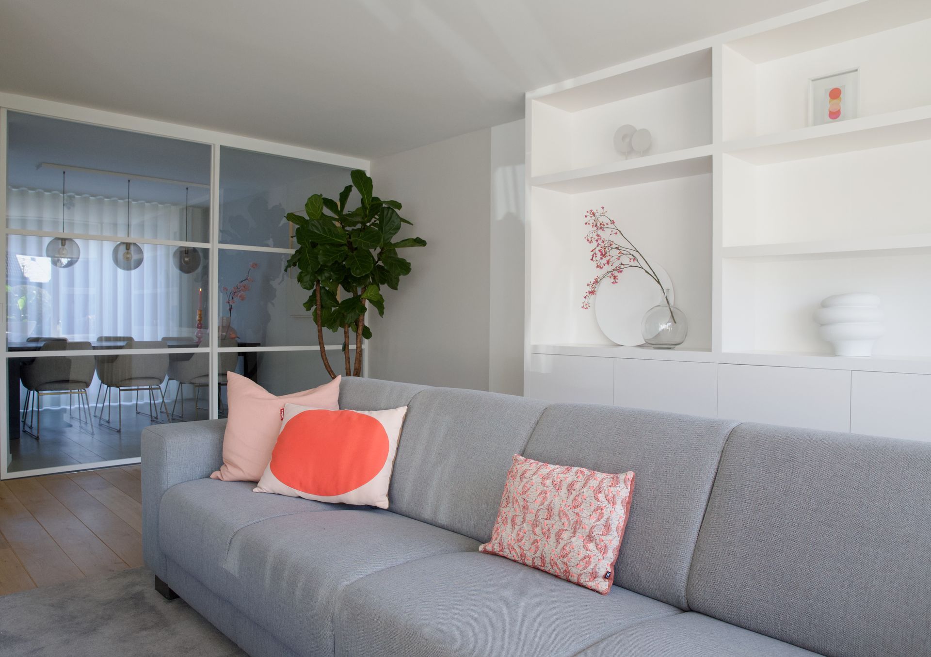 Bij dit project werd mij gevraagd een vakkenkast te ontwerpen en mee te denken over de kleuren en styling. De bewoners wilden graag rust in huis met wat kleur. Ik heb gekozen om de basis rustig te houden met de kleuren zwart, grijs en wit. Om het geheel meer pit te geven heb ik een neon oranje kleur met roze toegevoegd. De woonkamer en keuken zijn gescheiden door een afsluitbare stalen wand. Het woongedeelte heeft een licht eiken matte vloer, de keuken een lichtgrijze gietvloer. Het is een licht, fris huis geworden welke ook tijdloos is.