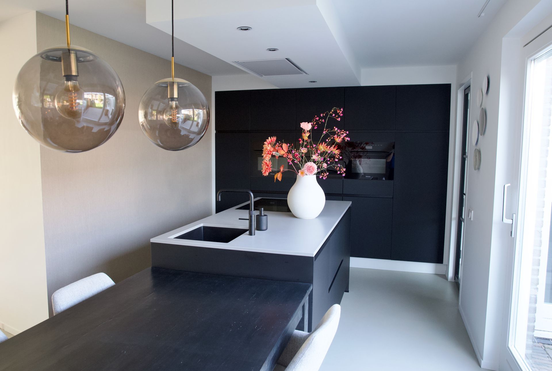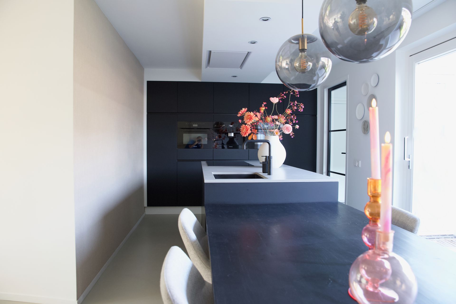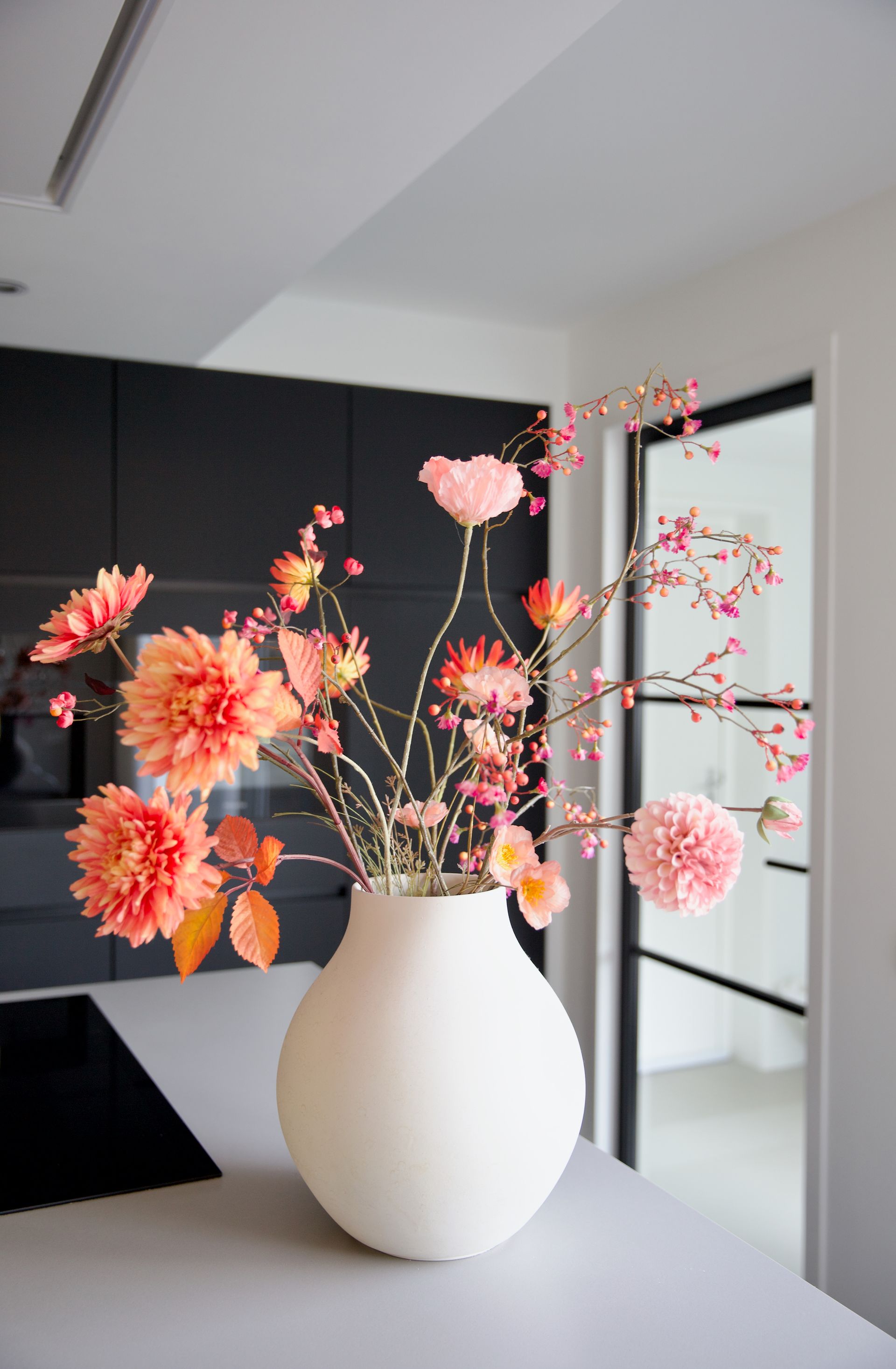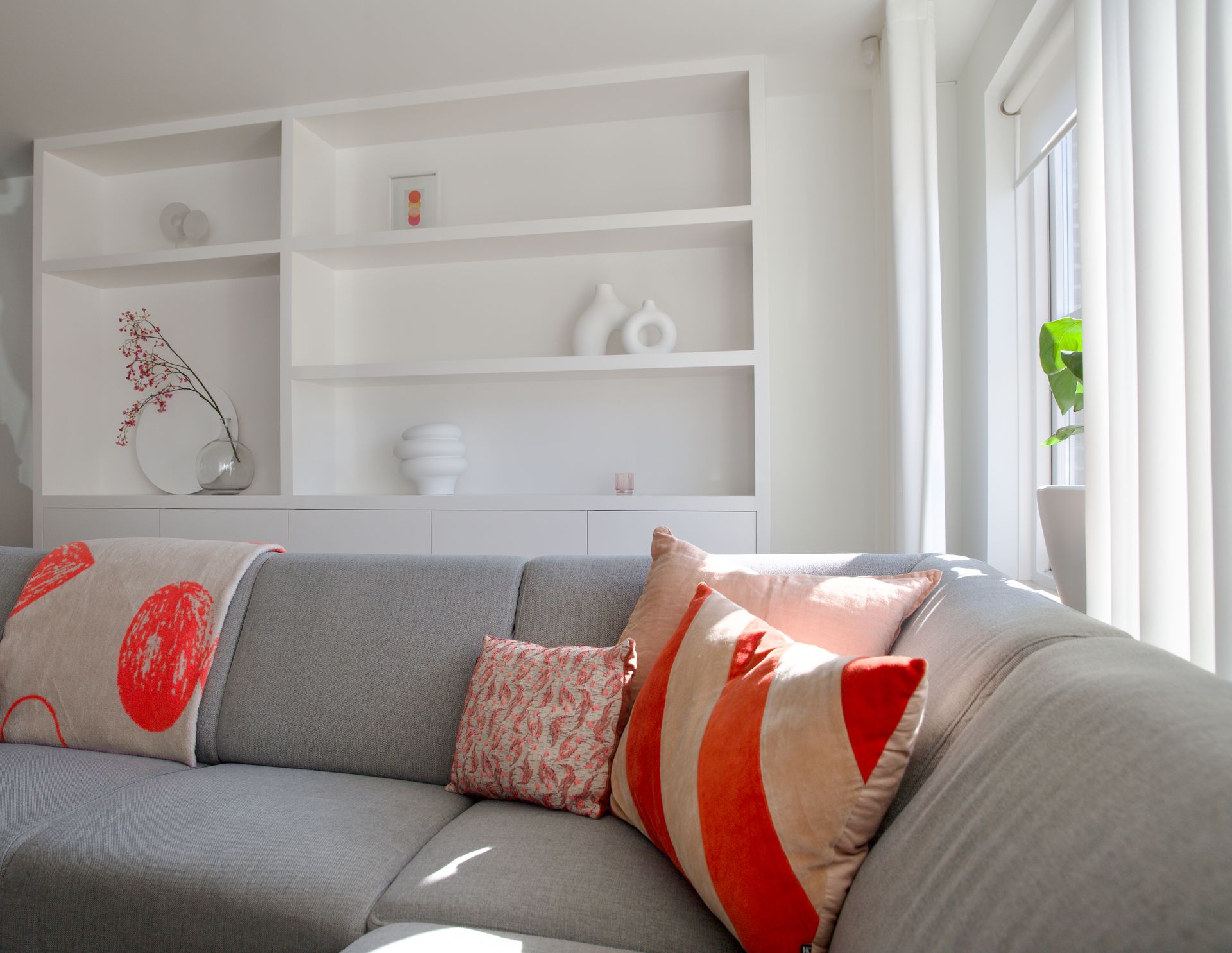 Bij dit project werd mij gevraagd een vakkenkast te ontwerpen en mee te denken over de kleuren en styling. De bewoners wilden graag rust in huis met wat kleur. Ik heb gekozen om de basis rustig te houden met de kleuren zwart, grijs en wit. Om het geheel meer pit te geven heb ik een neon oranje kleur met roze toegevoegd. De woonkamer en keuken zijn gescheiden door een afsluitbare stalen wand. Het woongedeelte heeft een licht eiken matte vloer, de keuken een lichtgrijze gietvloer. Het is een licht, fris huis geworden welke ook tijdloos is.