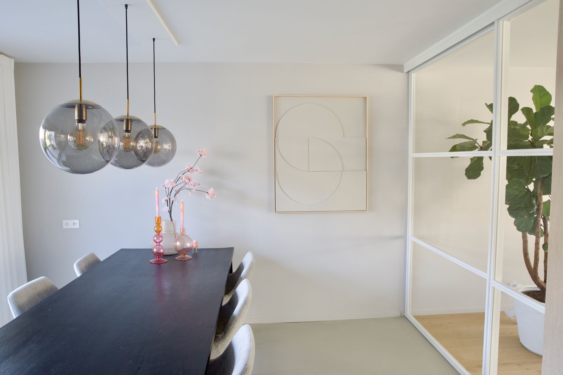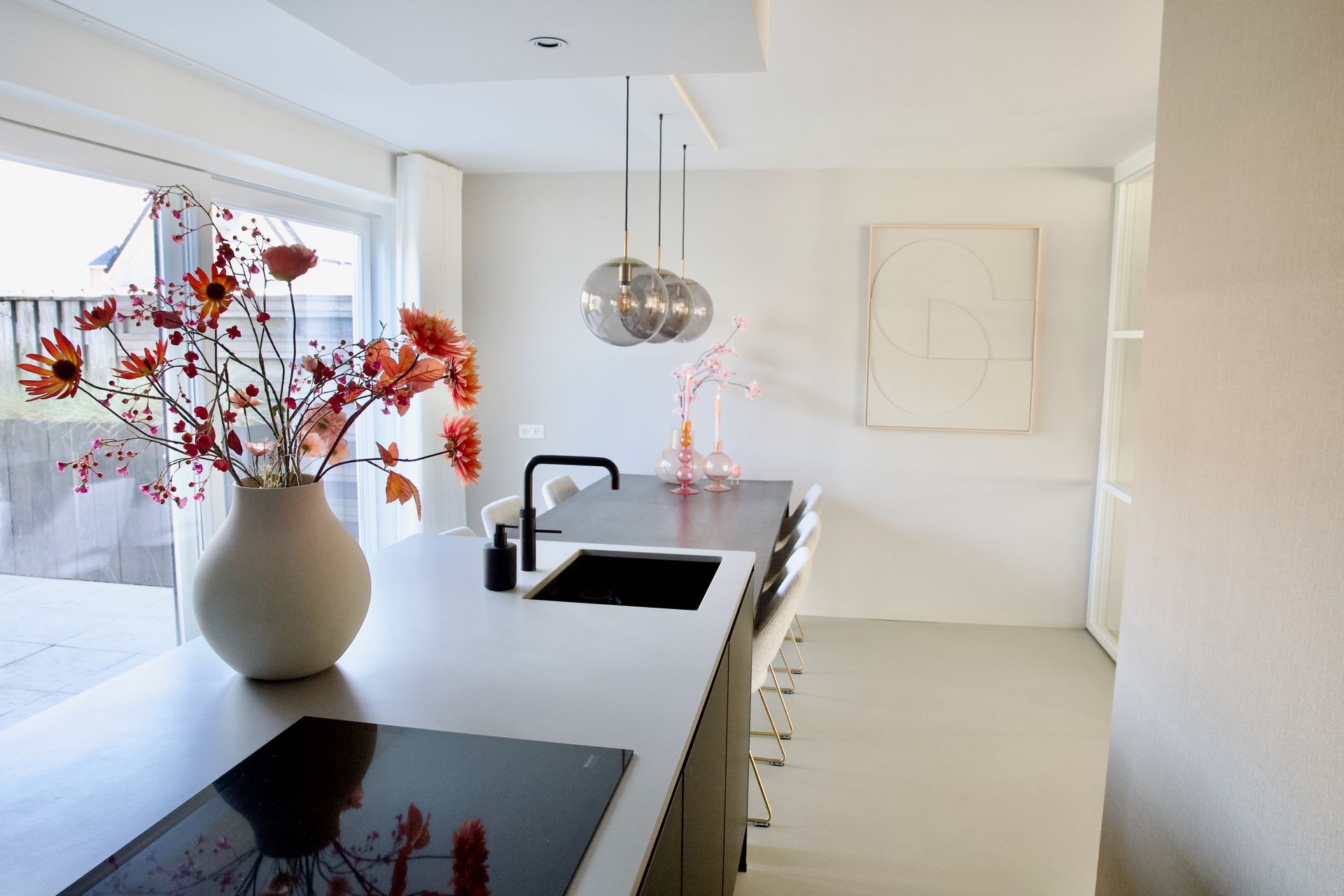 De wens voor deze woonkamer was een Scandinavisch interieur met kleur. Er werd me ook gevraagd mee te denken over de lange, kale muur. Ik heb gekozen voor een speelse posterwand, zodat dit bij binnenkomst gelijk een eyecatcher is. Er zijn nieuwe stalen deuren geplaatst voor meer lichtinval en om het geheel ruimtelijker te laten lijken. Om de akoestiek in de werkhoek te verbeteren zijn er houten latten met vilt bevestigd. Op de wand in de zithoek is een afgezwakte blauw/groene kleur geschilderd, deze is voorzien van ingelijste posters in kleurrijke tinten. De achterwand van de keuken is van een koraalkleur voorzien. Dit geeft ook weer warmte aan het geheel. Alle accessoires zijn in warme en koele tinten gecombineerd. Dit alles zorgt voor een verrassend resultaat.