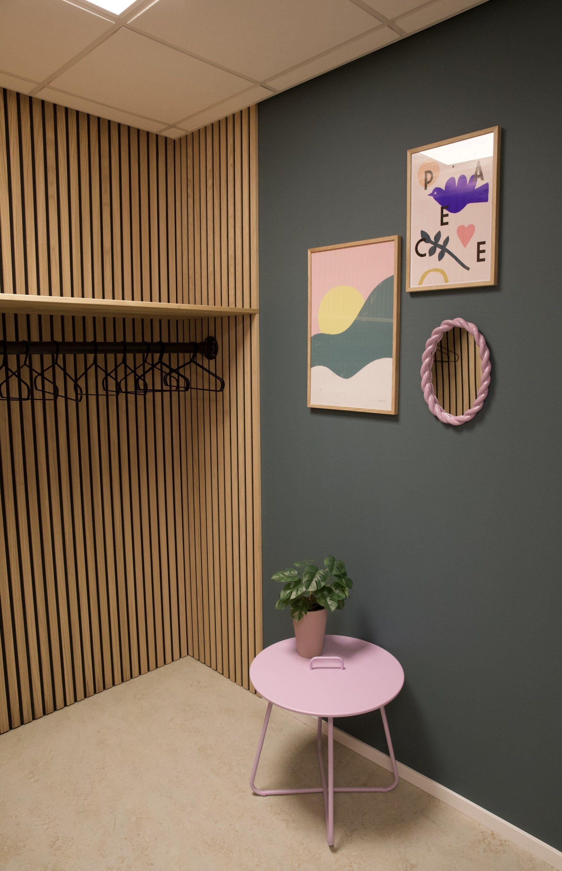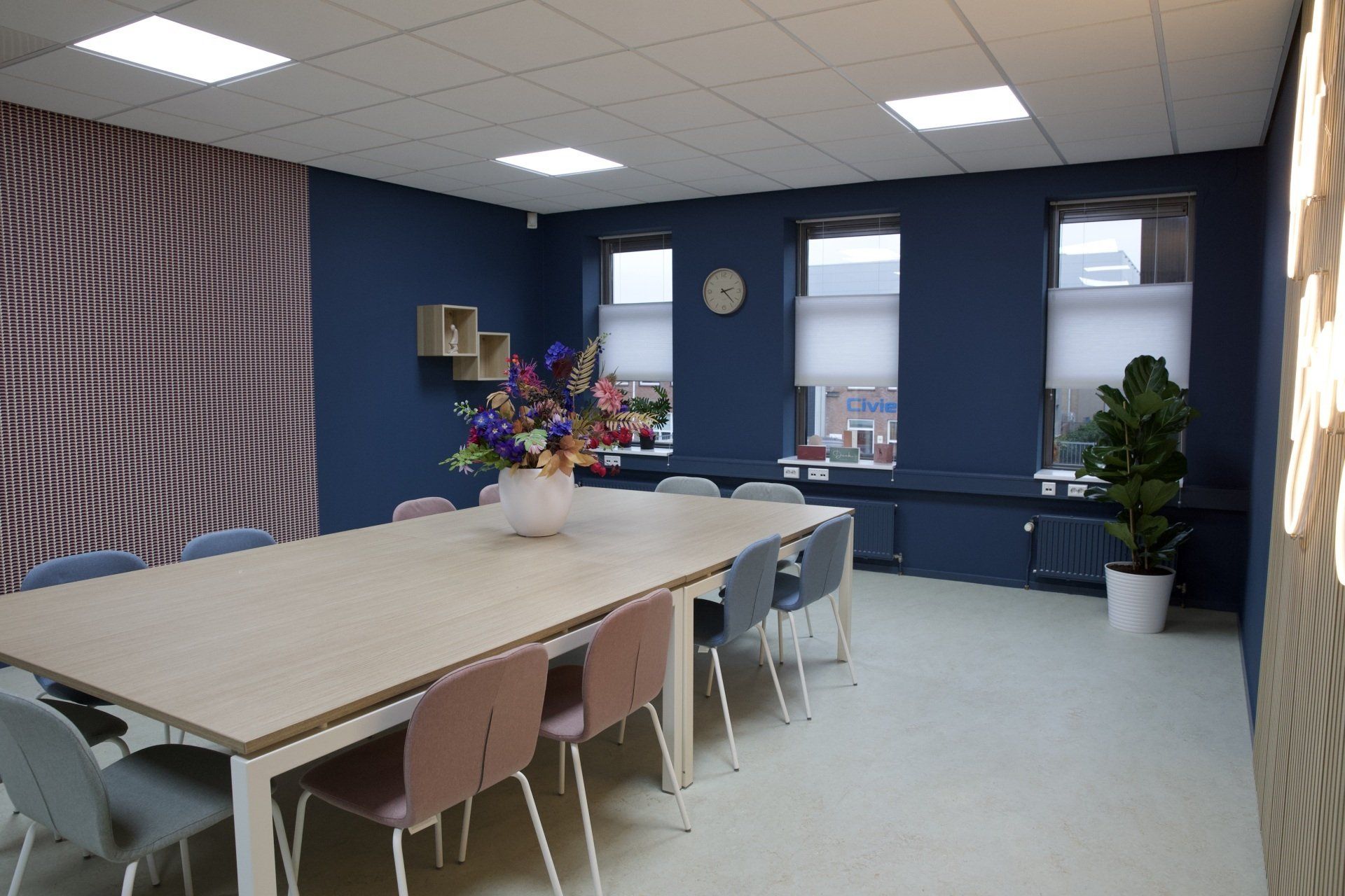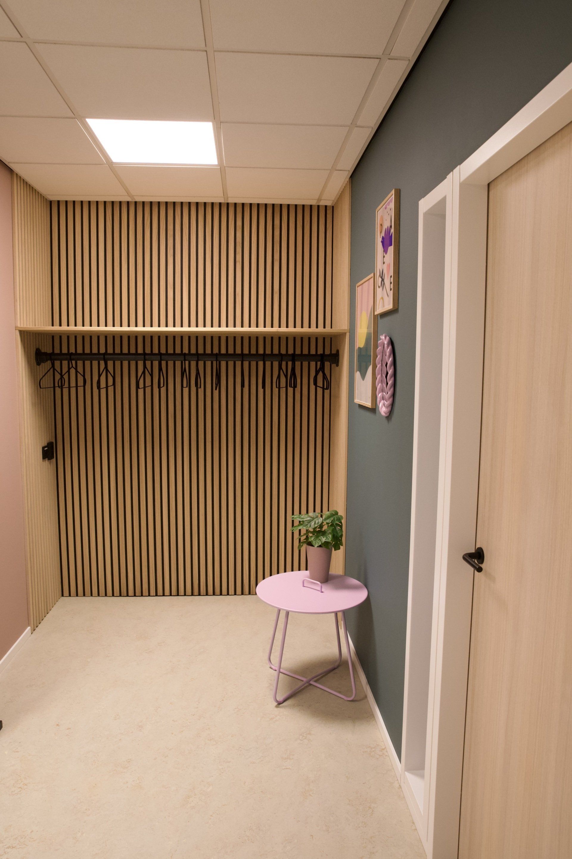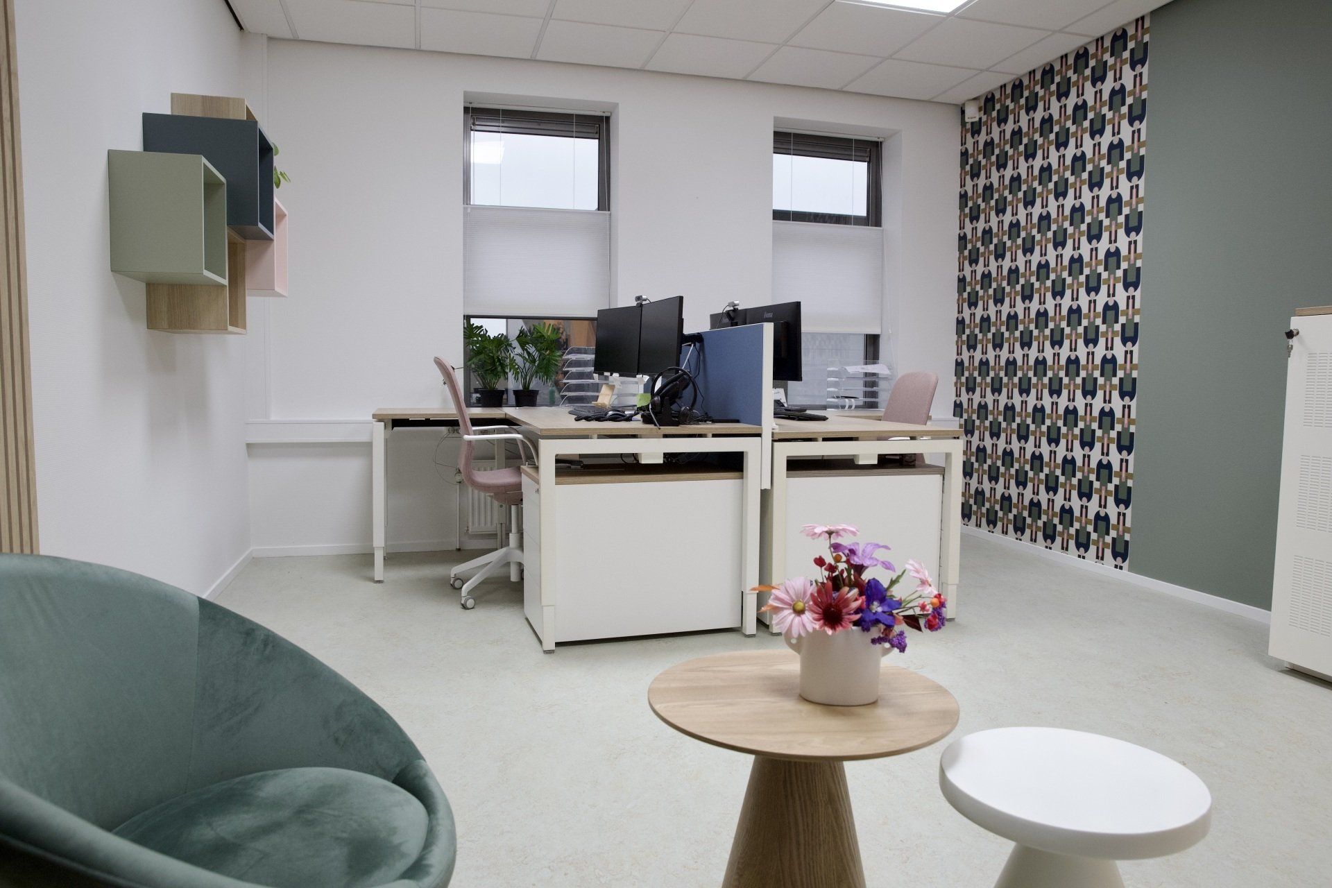 Dit kantoor betreft een zaal waar opleidingen gegeven worden, 2 werkruimtes en een besprekingsruimte. Ik kreeg de vrije hand dit gehele project te ontwerpen. Ik heb gekozen voor een retrostijl in een Scandinavisch jasje. Er is gebruik gemaakt van een kleurenpalet van blauw, roze, petrol en lila. Om het Scandinavische gevoel terug te laten komen is er in alle ruimtes licht eikenhout toegepast. Om de grote ruimtes knusser aan te laten voelen en ervoor te zorgen dat het niet galmt zijn er houten akoestische panelen op de wanden aangebracht en roomdividers van stof geplaatst bij de bureau's, zodat de werknemers in alle rust kunnen telefoneren. Het kleurenpalet is in alle ruimtes toegepast, zodat het een mooi samenhangend geheel is geworden. Het is een fijn kantoor met veel ruimte waar nog jarenlang met plezier gewerkt kan worden!