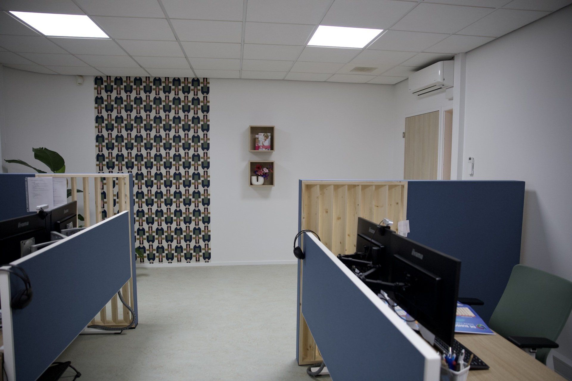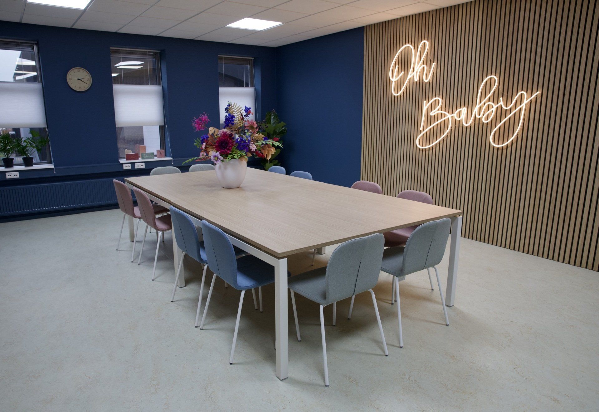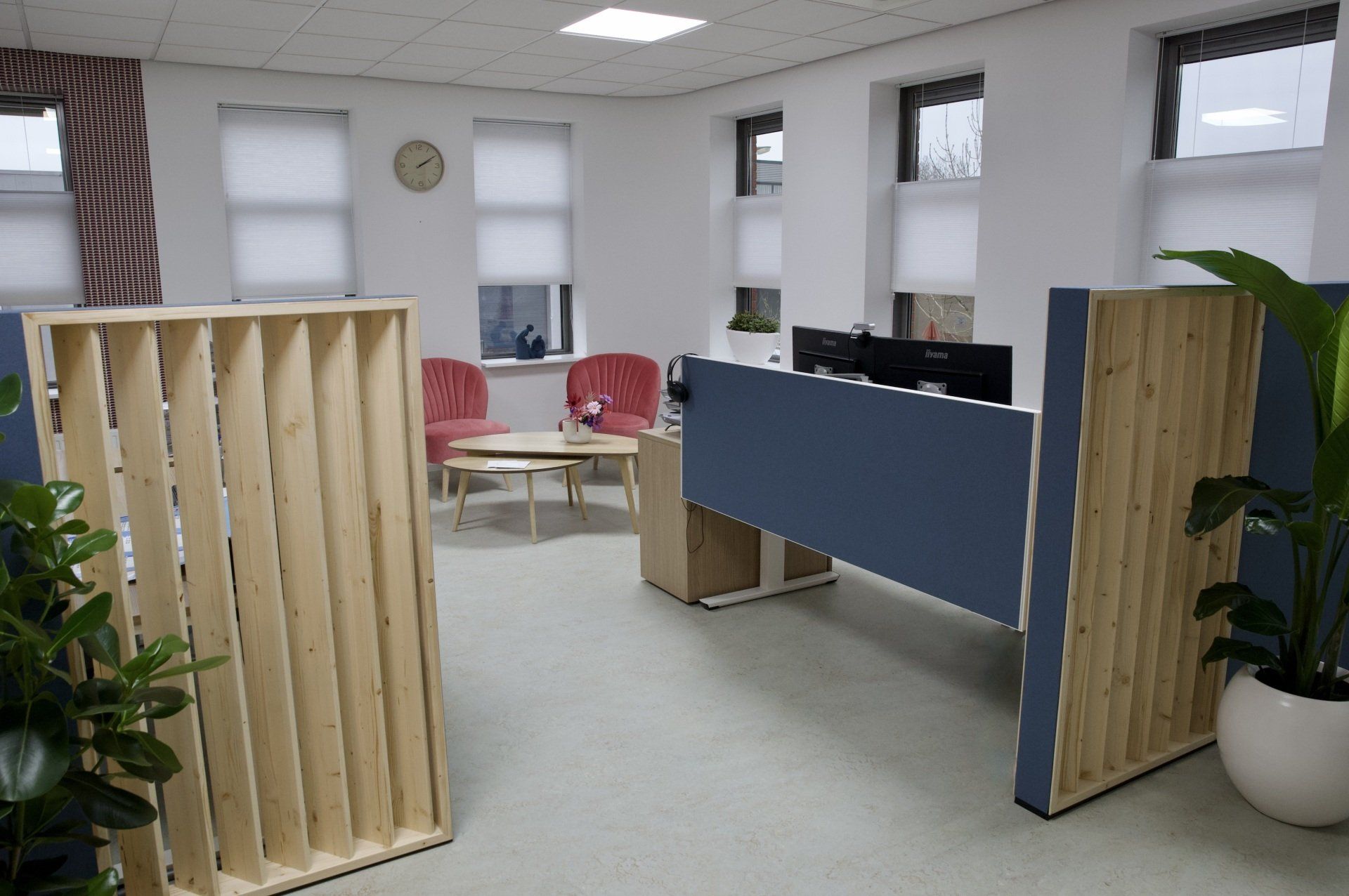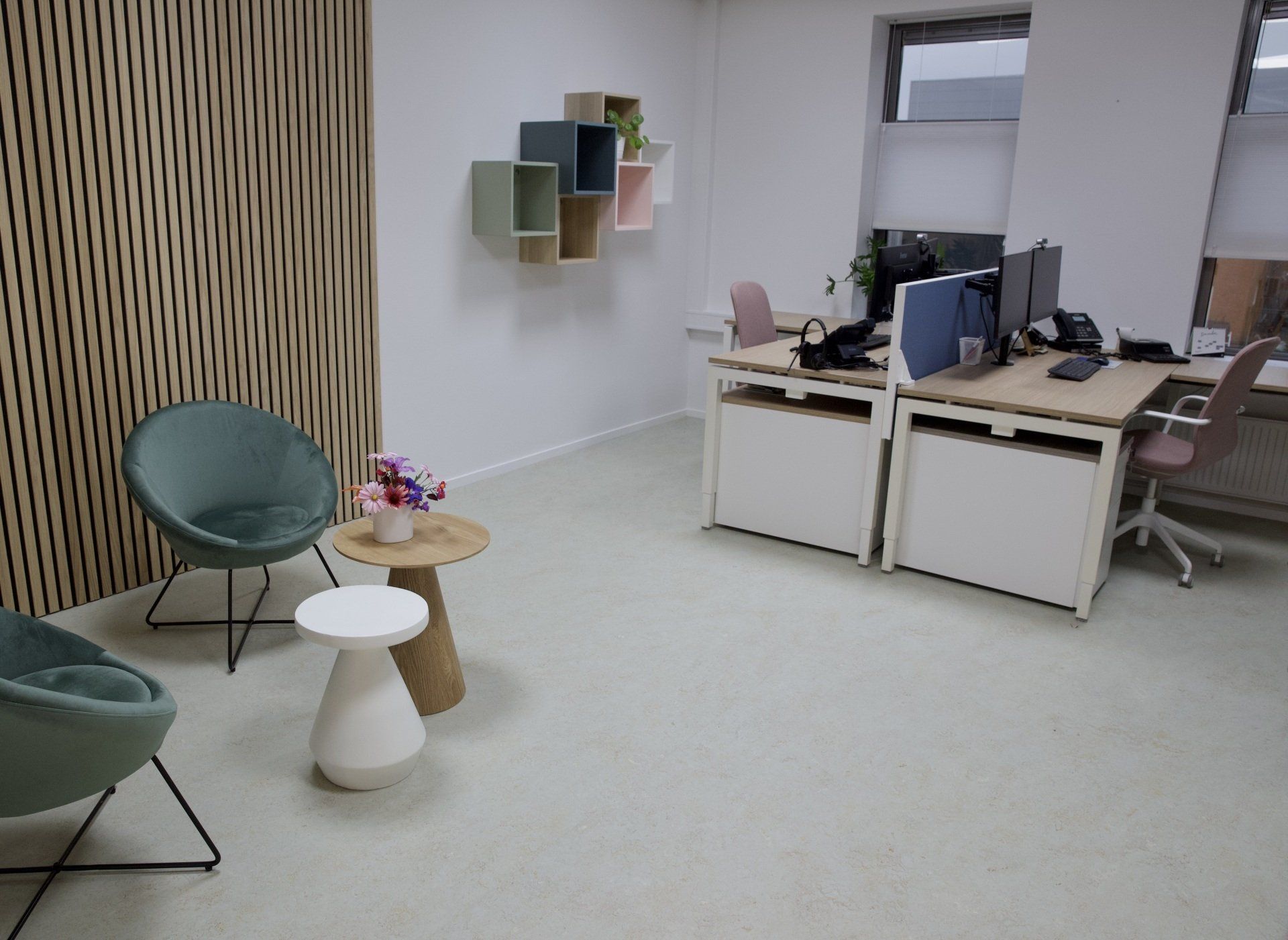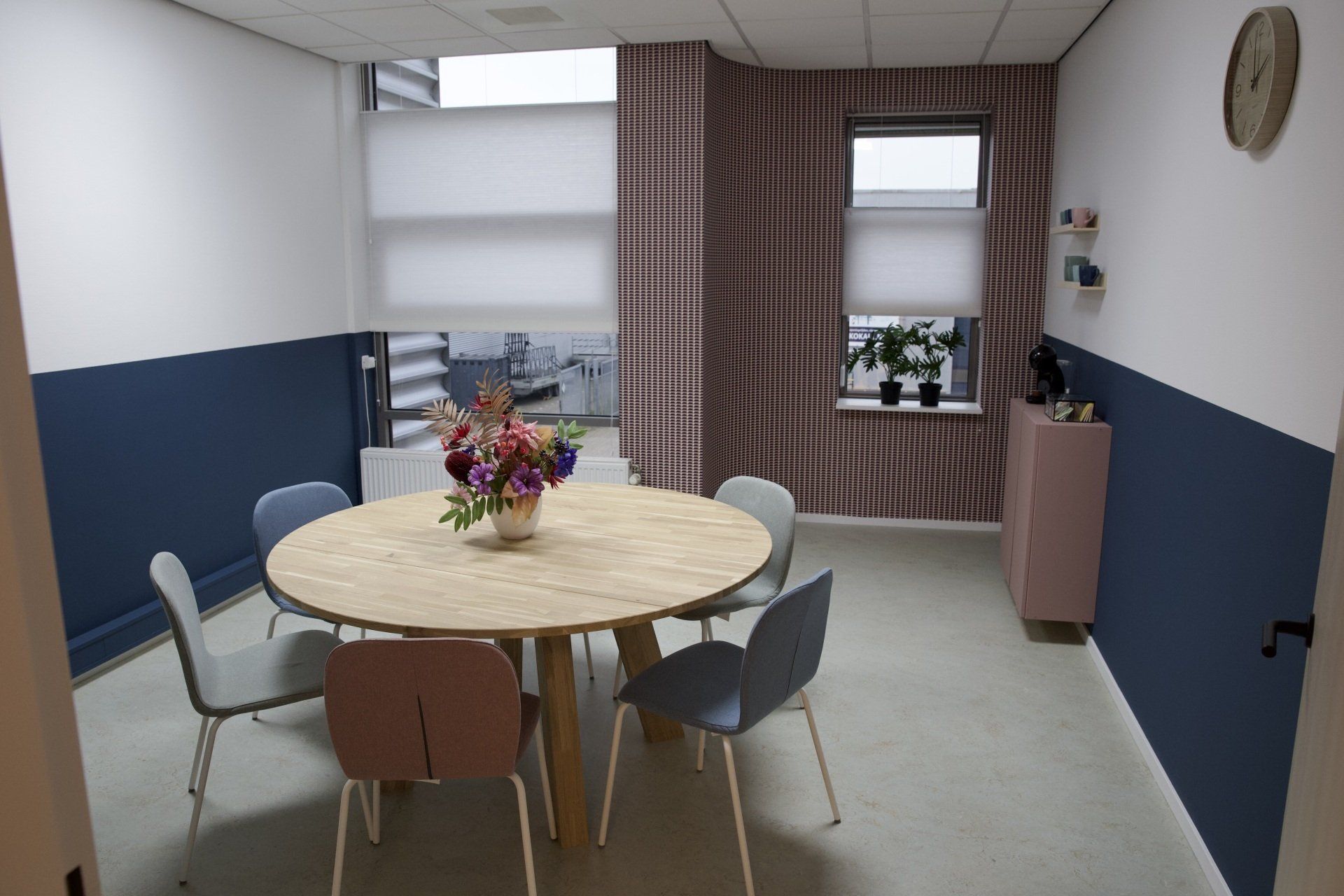 Dit kantoor betreft een zaal waar opleidingen gegeven worden, 2 werkruimtes en een besprekingsruimte. Ik kreeg de vrije hand dit gehele project te ontwerpen. Ik heb gekozen voor een retrostijl in een Scandinavisch jasje. Er is gebruik gemaakt van een kleurenpalet van blauw, roze, petrol en lila. Om het Scandinavische gevoel terug te laten komen is er in alle ruimtes licht eikenhout toegepast. Om de grote ruimtes knusser aan te laten voelen en ervoor te zorgen dat het niet galmt zijn er houten akoestische panelen op de wanden aangebracht en roomdividers van stof geplaatst bij de bureau's, zodat de werknemers in alle rust kunnen telefoneren. Het kleurenpalet is in alle ruimtes toegepast, zodat het een mooi samenhangend geheel is geworden. Het is een fijn kantoor met veel ruimte waar nog jarenlang met plezier gewerkt kan worden!