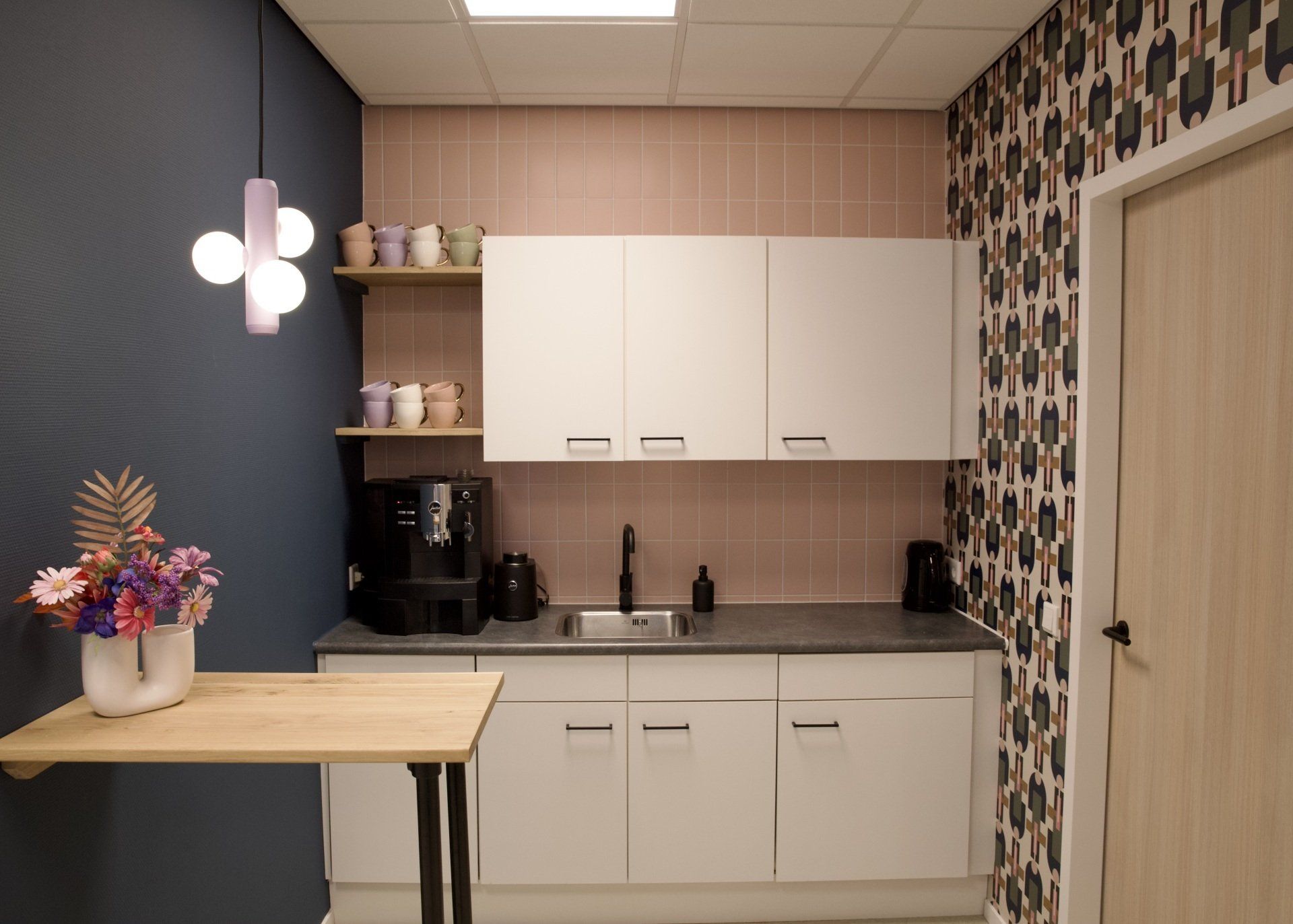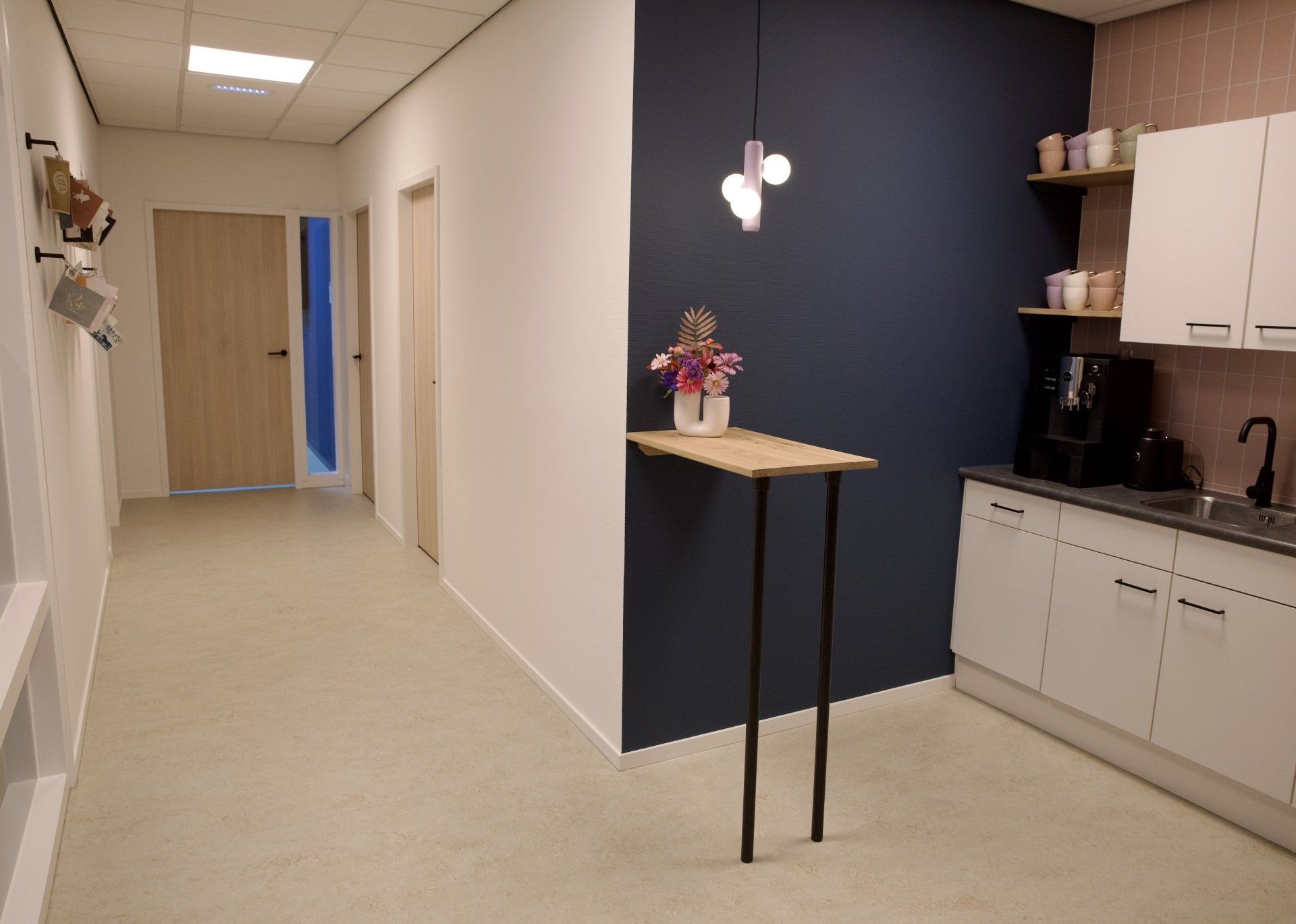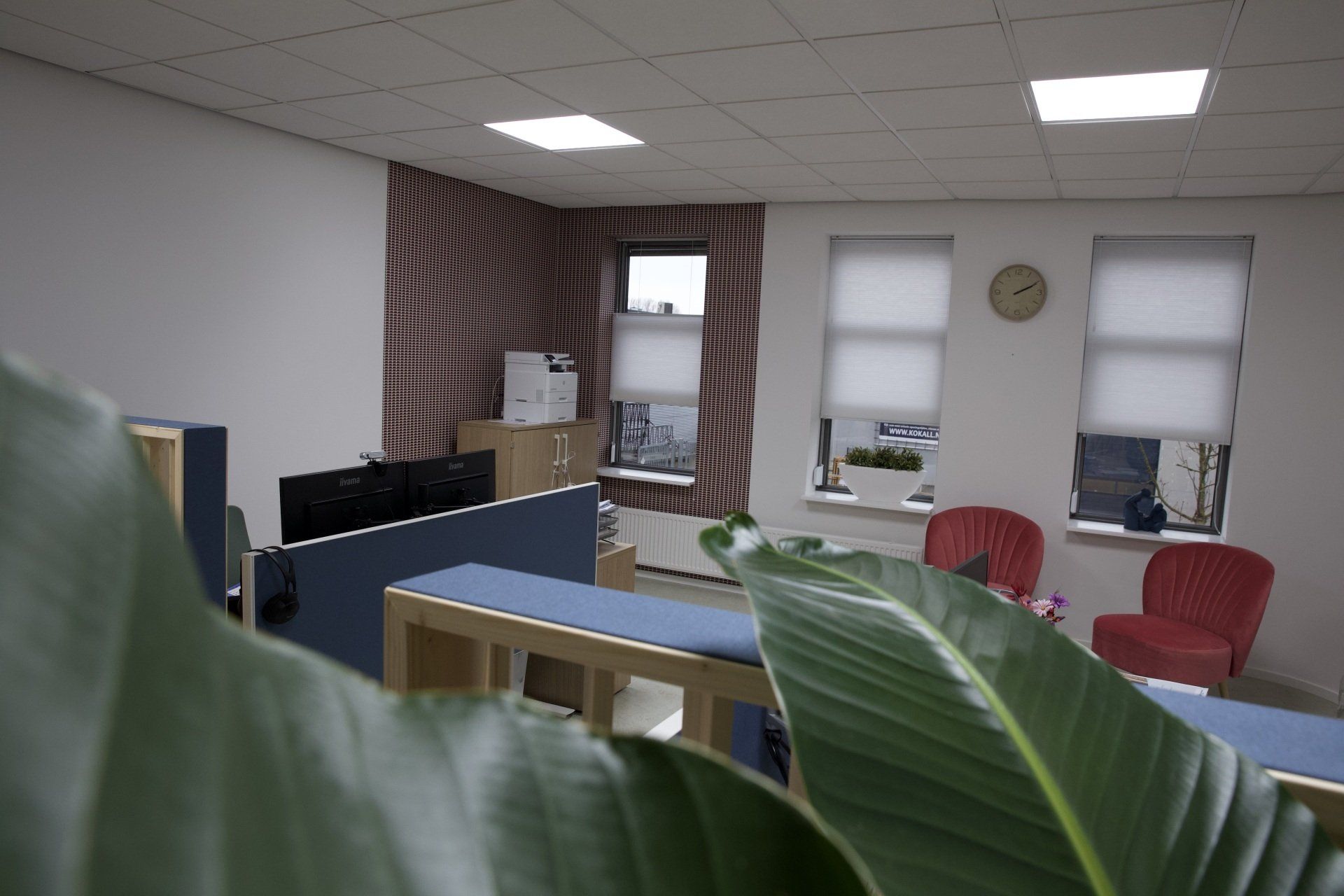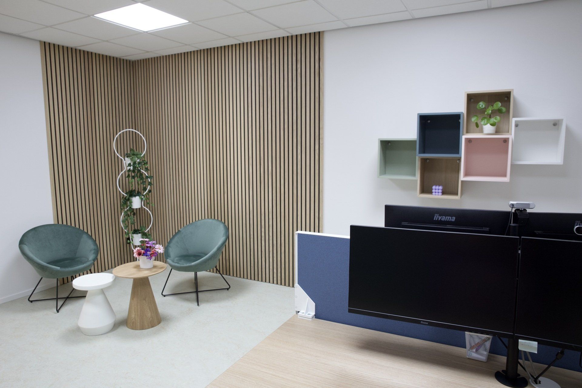 Dit kantoor betreft een zaal waar opleidingen gegeven worden, 2 werkruimtes en een besprekingsruimte. Ik kreeg de vrije hand dit gehele project te ontwerpen. Ik heb gekozen voor een retrostijl in een Scandinavisch jasje. Er is gebruik gemaakt van een kleurenpalet van blauw, roze, petrol en lila. Om het Scandinavische gevoel terug te laten komen is er in alle ruimtes licht eikenhout toegepast. Om de grote ruimtes knusser aan te laten voelen en ervoor te zorgen dat het niet galmt zijn er houten akoestische panelen op de wanden aangebracht en roomdividers van stof geplaatst bij de bureau's, zodat de werknemers in alle rust kunnen telefoneren. Het kleurenpalet is in alle ruimtes toegepast, zodat het een mooi samenhangend geheel is geworden. Het is een fijn kantoor met veel ruimte waar nog jarenlang met plezier gewerkt kan worden!