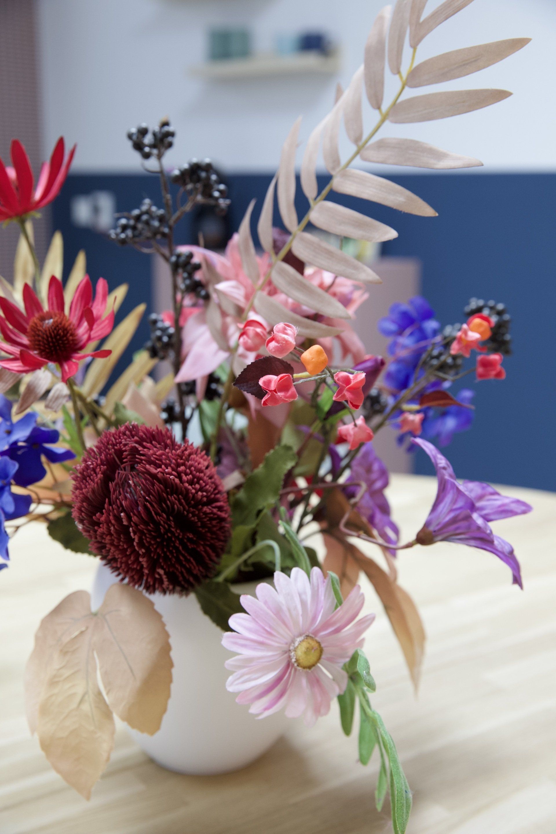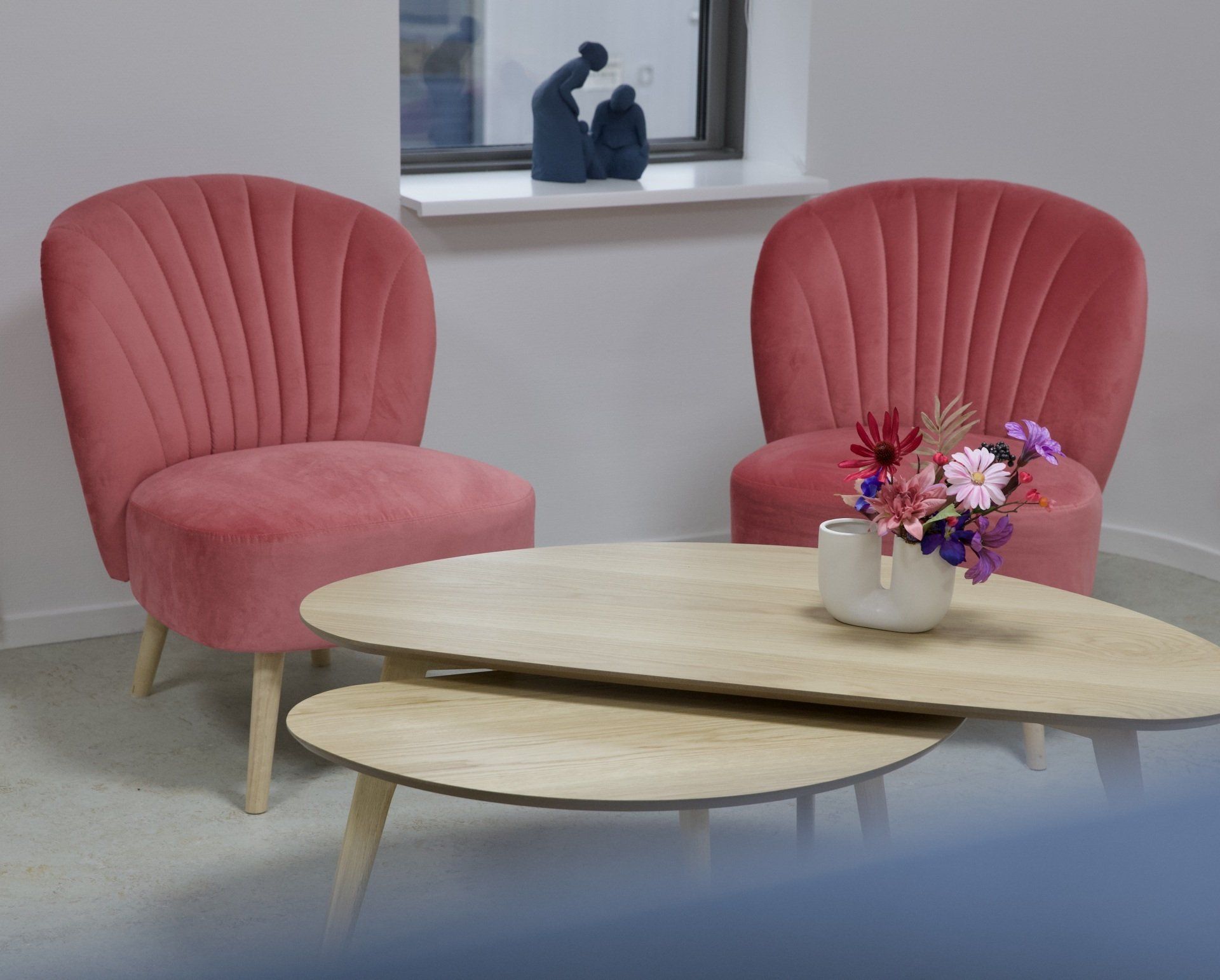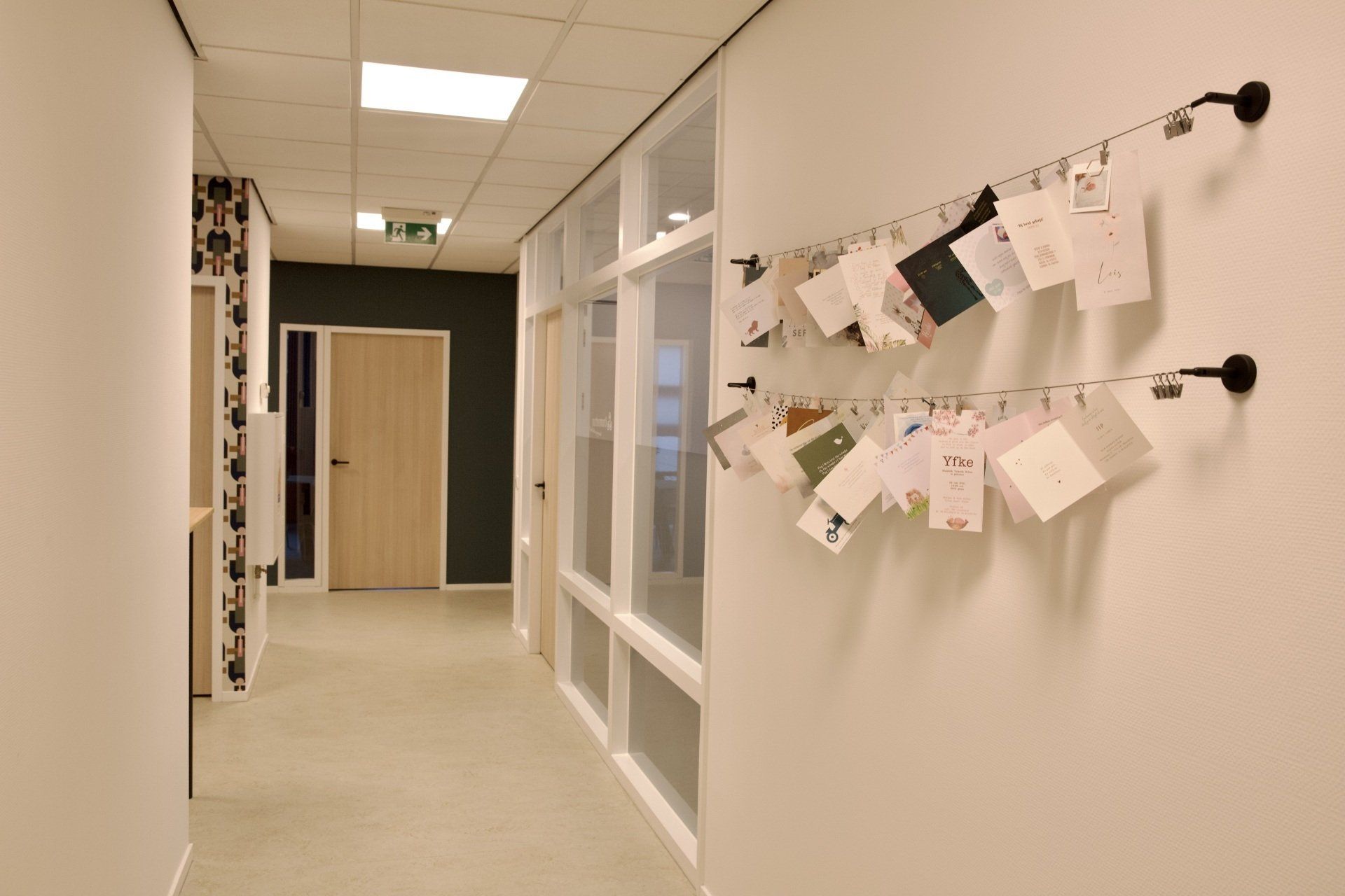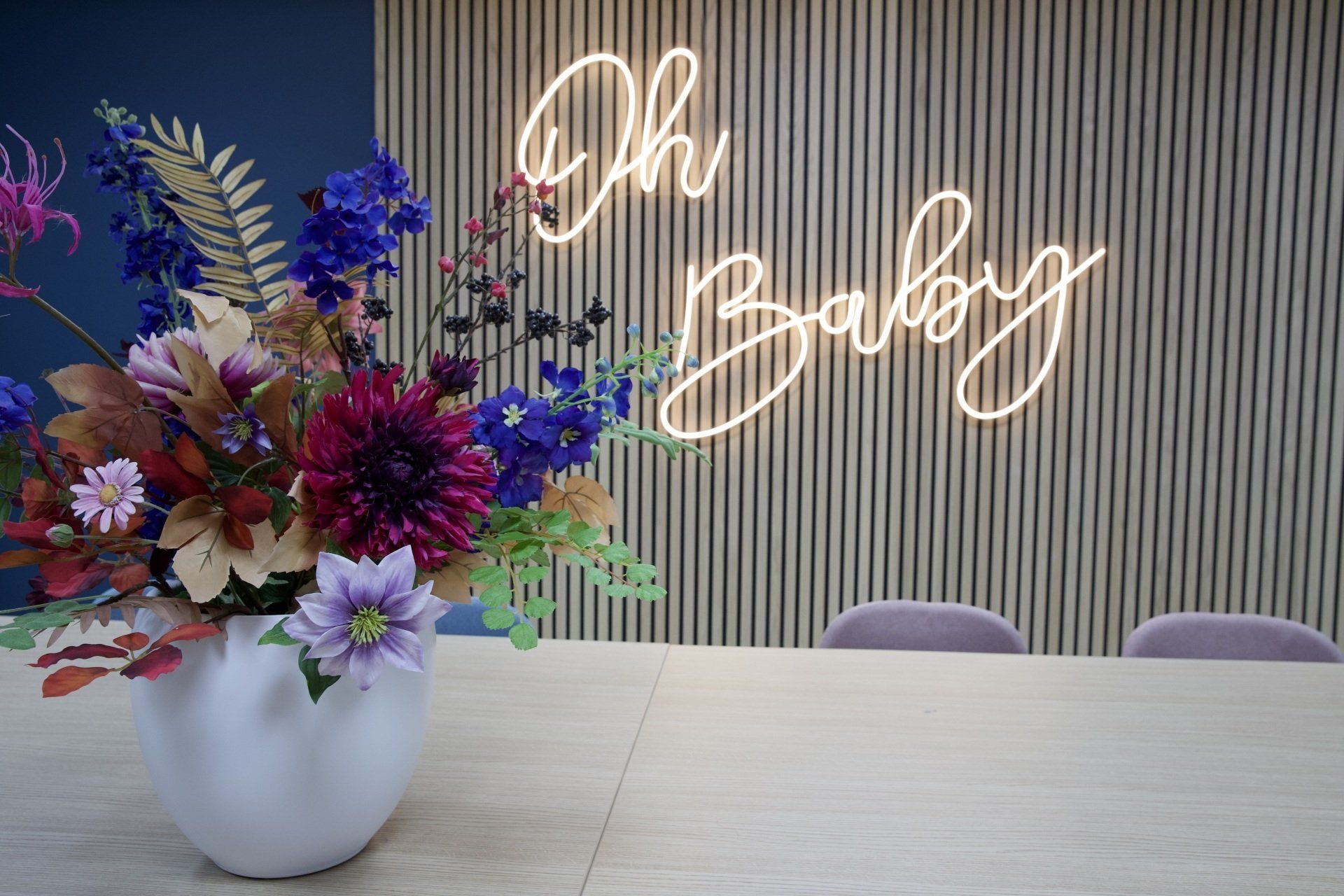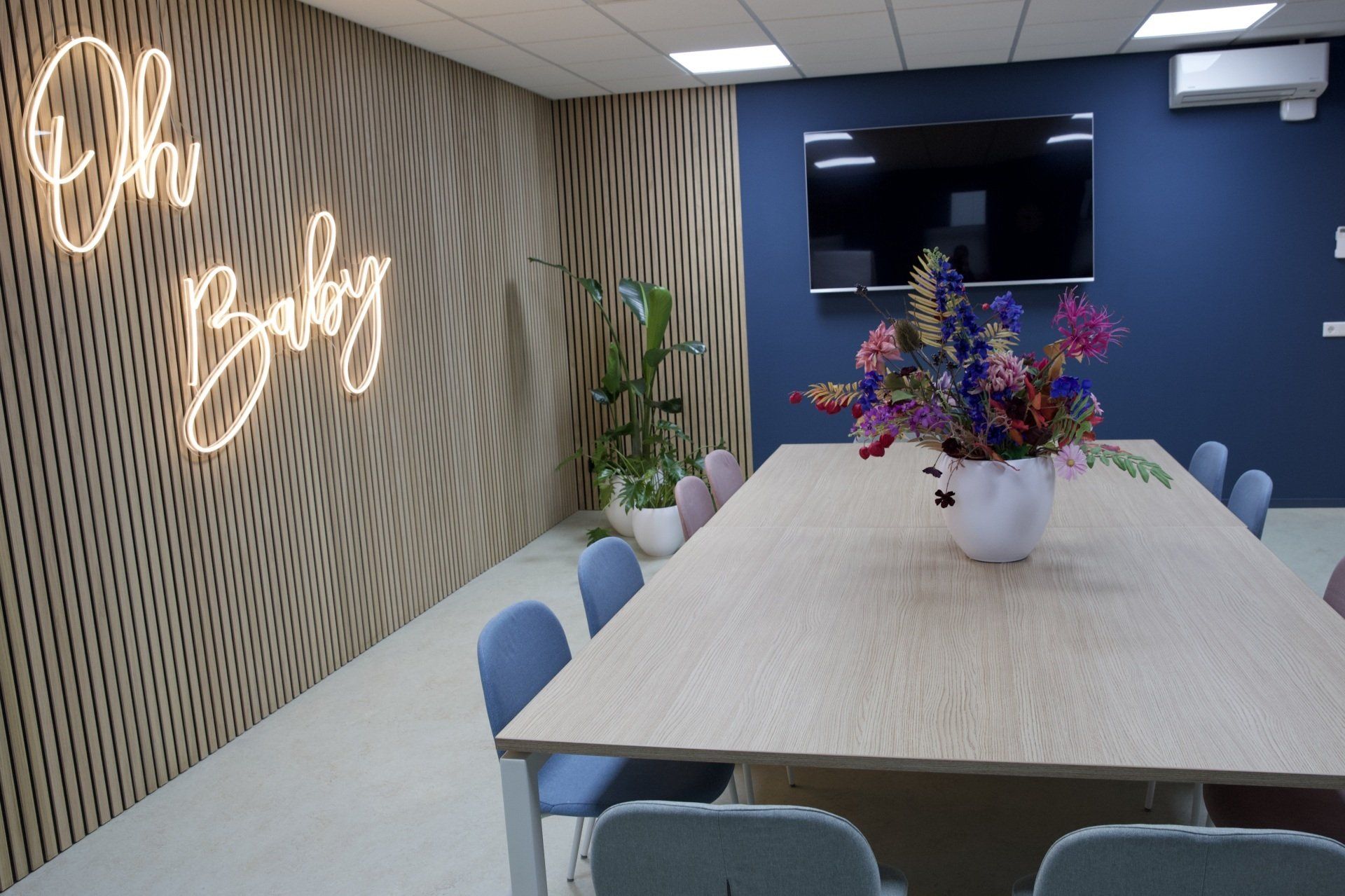 Dit kantoor betreft een zaal waar opleidingen gegeven worden, 2 werkruimtes en een besprekingsruimte. Ik kreeg de vrije hand dit gehele project te ontwerpen. Ik heb gekozen voor een retrostijl in een Scandinavisch jasje. Er is gebruik gemaakt van een kleurenpalet van blauw, roze, petrol en lila. Om het Scandinavische gevoel terug te laten komen is er in alle ruimtes licht eikenhout toegepast. Om de grote ruimtes knusser aan te laten voelen en ervoor te zorgen dat het niet galmt zijn er houten akoestische panelen op de wanden aangebracht en roomdividers van stof geplaatst bij de bureau's, zodat de werknemers in alle rust kunnen telefoneren. Het kleurenpalet is in alle ruimtes toegepast, zodat het een mooi samenhangend geheel is geworden. Het is een fijn kantoor met veel ruimte waar nog jarenlang met plezier gewerkt kan worden!
