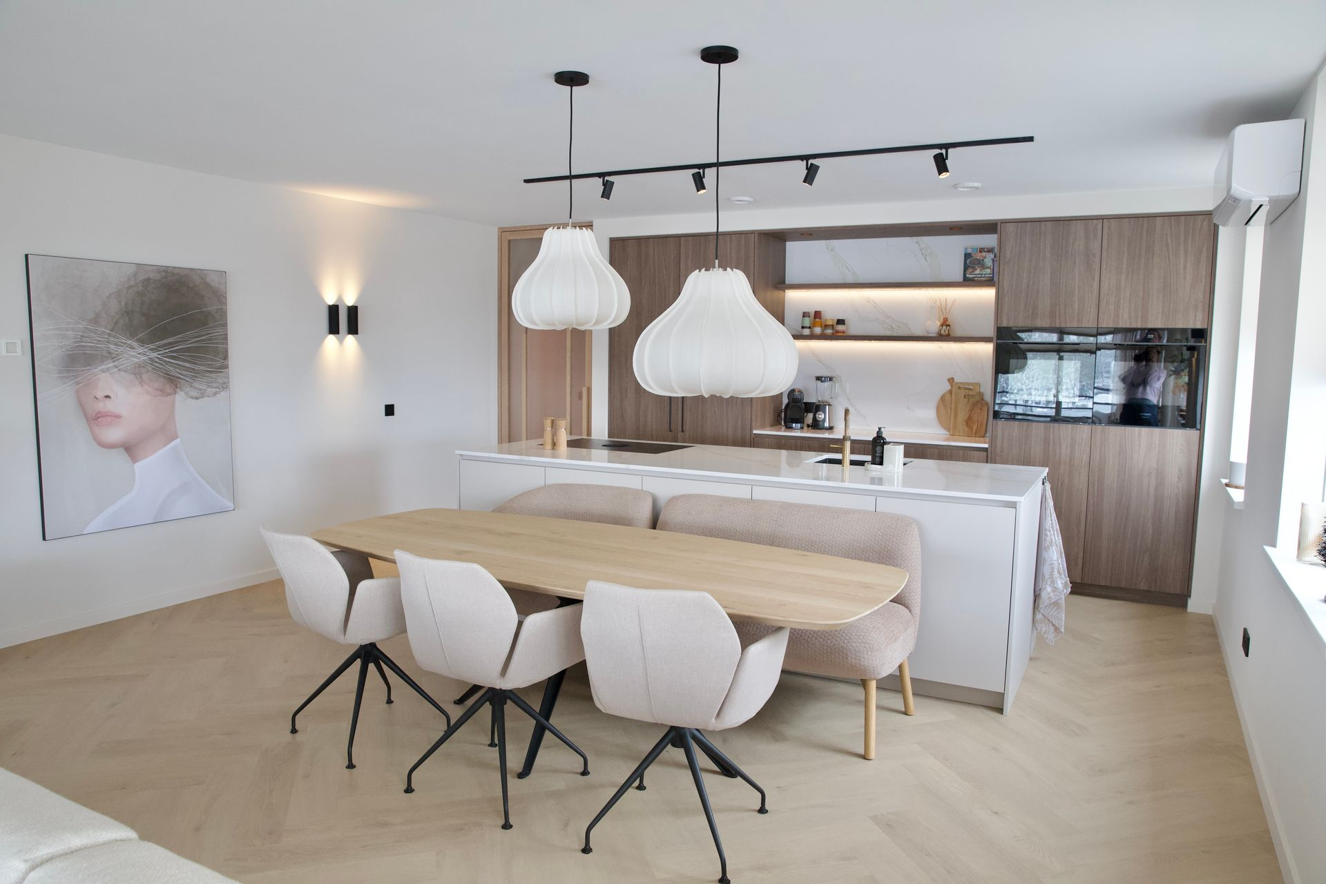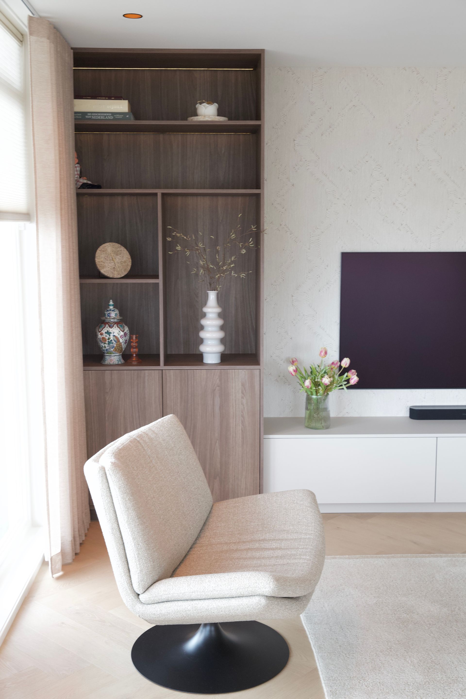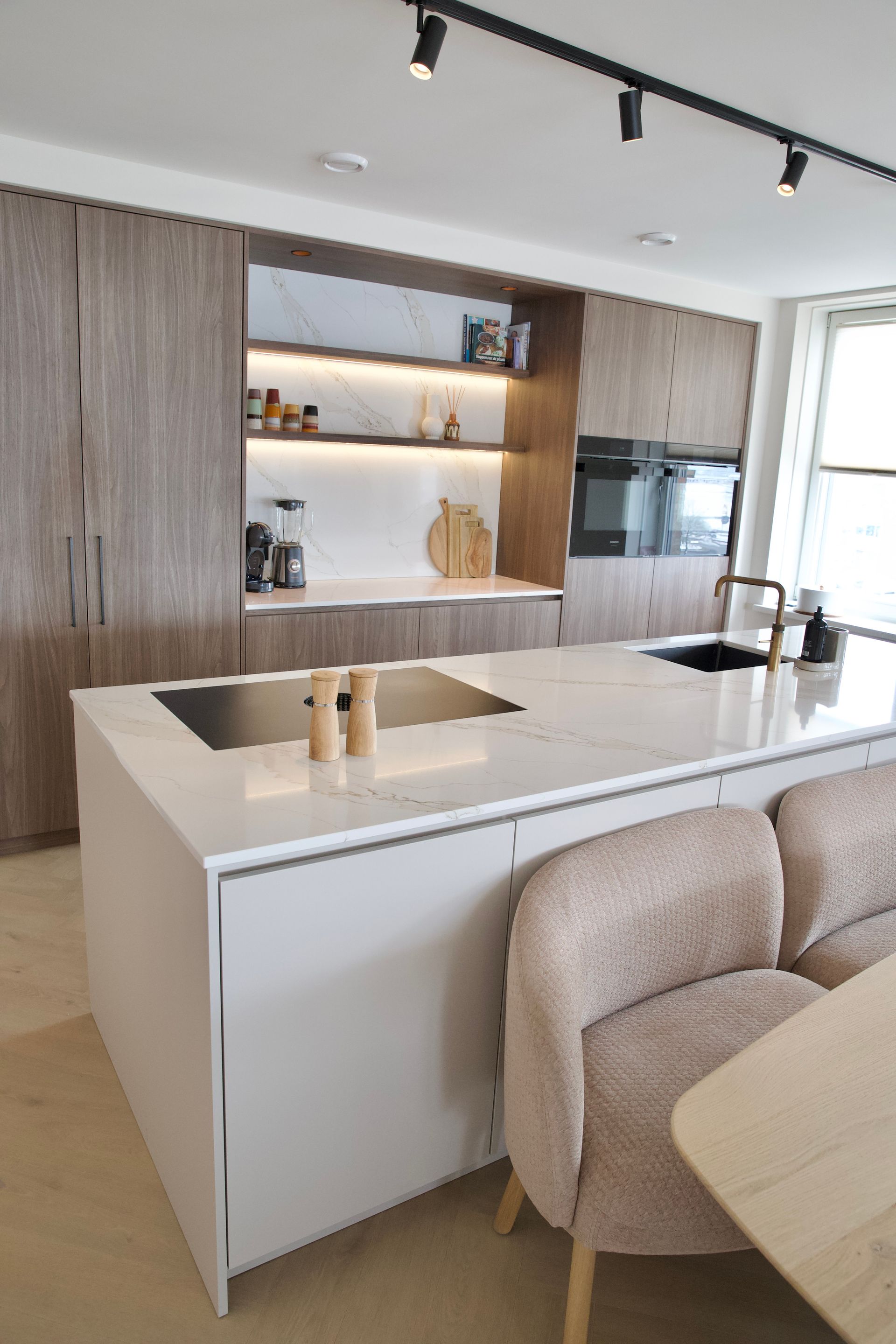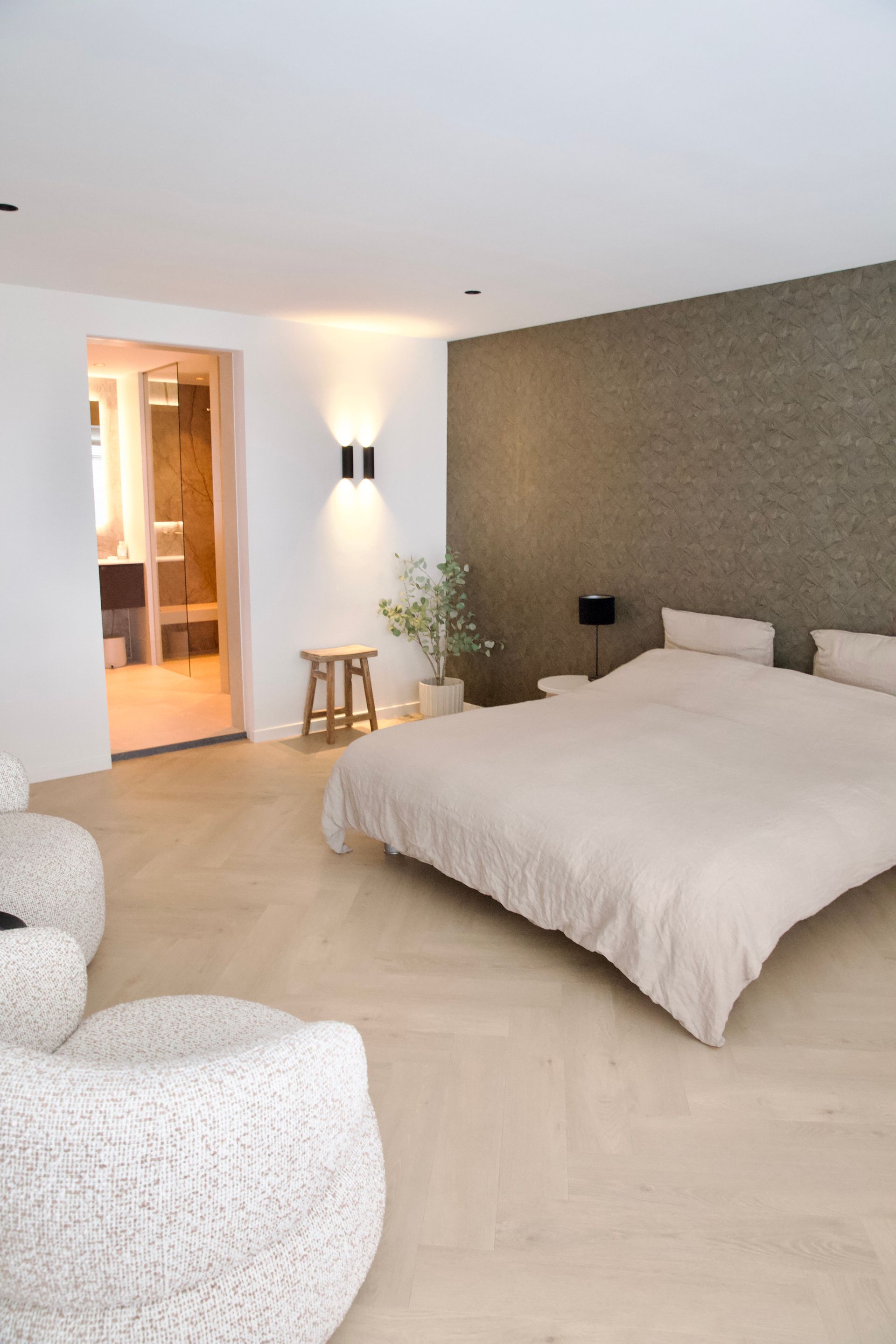 De wens van de bewoners was een licht, tijdloos en rustige inrichting. De woonkamer straalt verfijnde rust uit, met een keuken die luxe en functionaliteit moeiteloos combineert. De badkamer biedt een serene, spa-achtige ervaring. Door middel van een schuifdeur kom je uit in de slaapkamer. Deze vormt een stijlvolle plek om tot rust te komen, met oog voor comfort en detail. De inloopkast maakt het geheel compleet als een rustige, overzichtelijke ruimte waarin alles zijn eigen plek heeft.