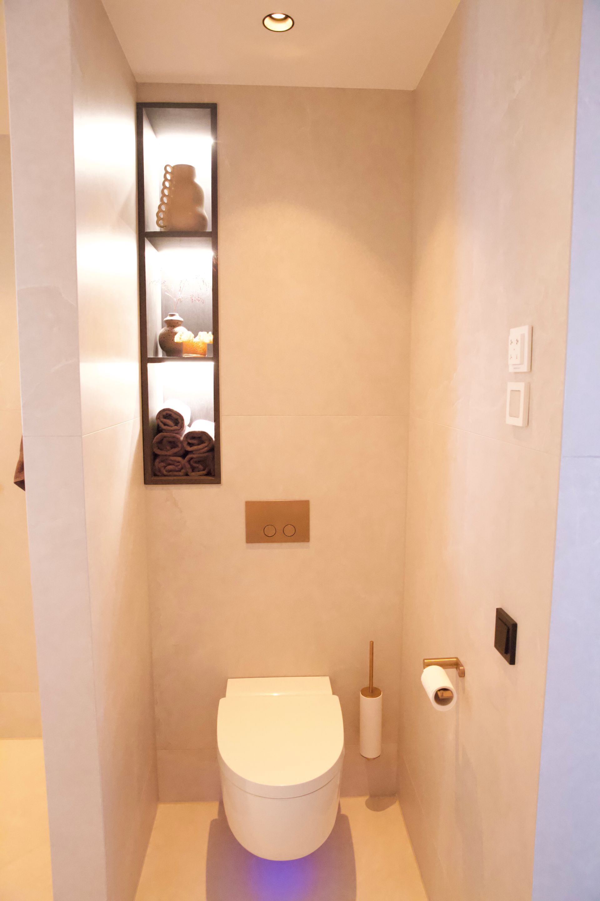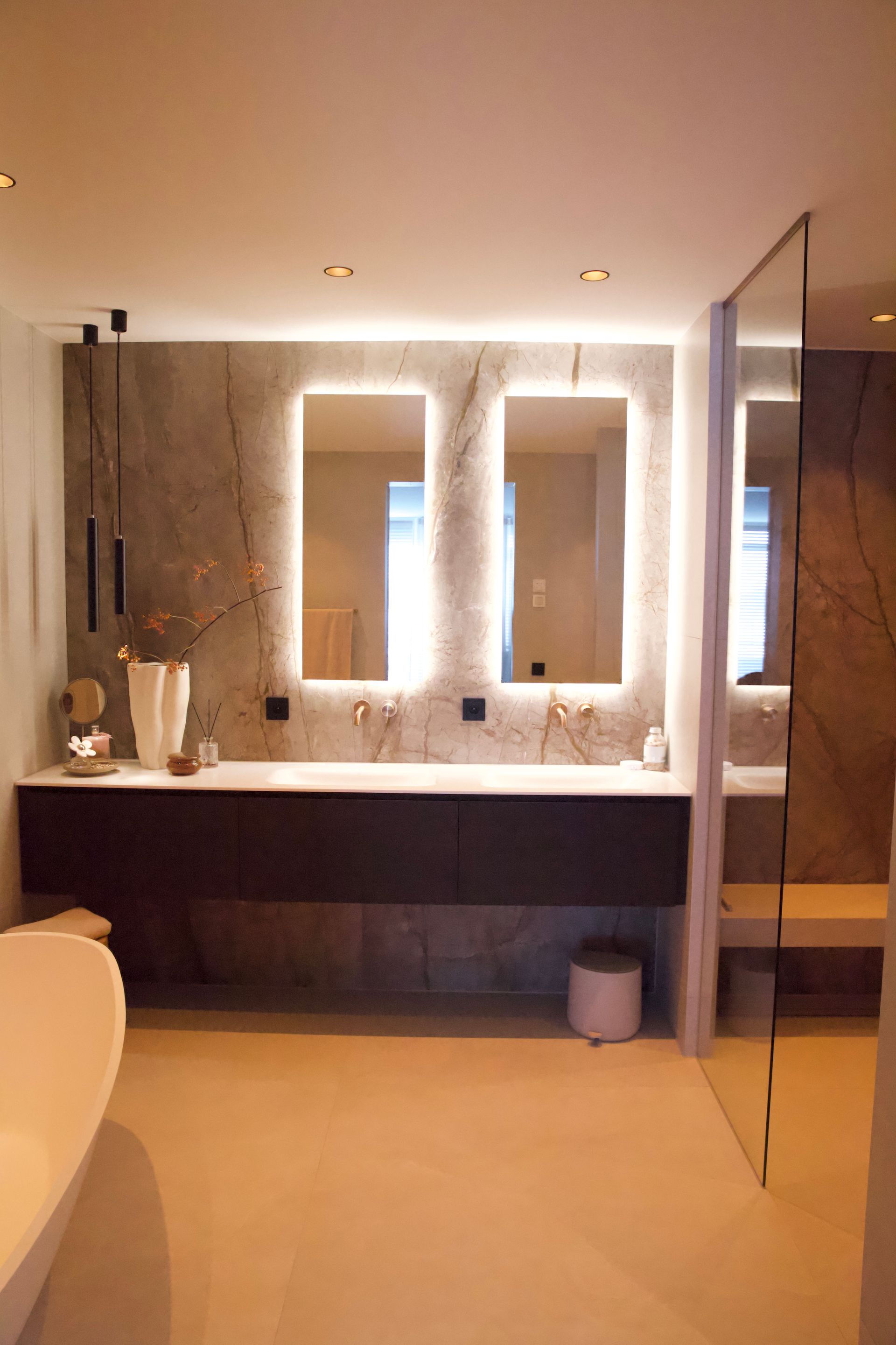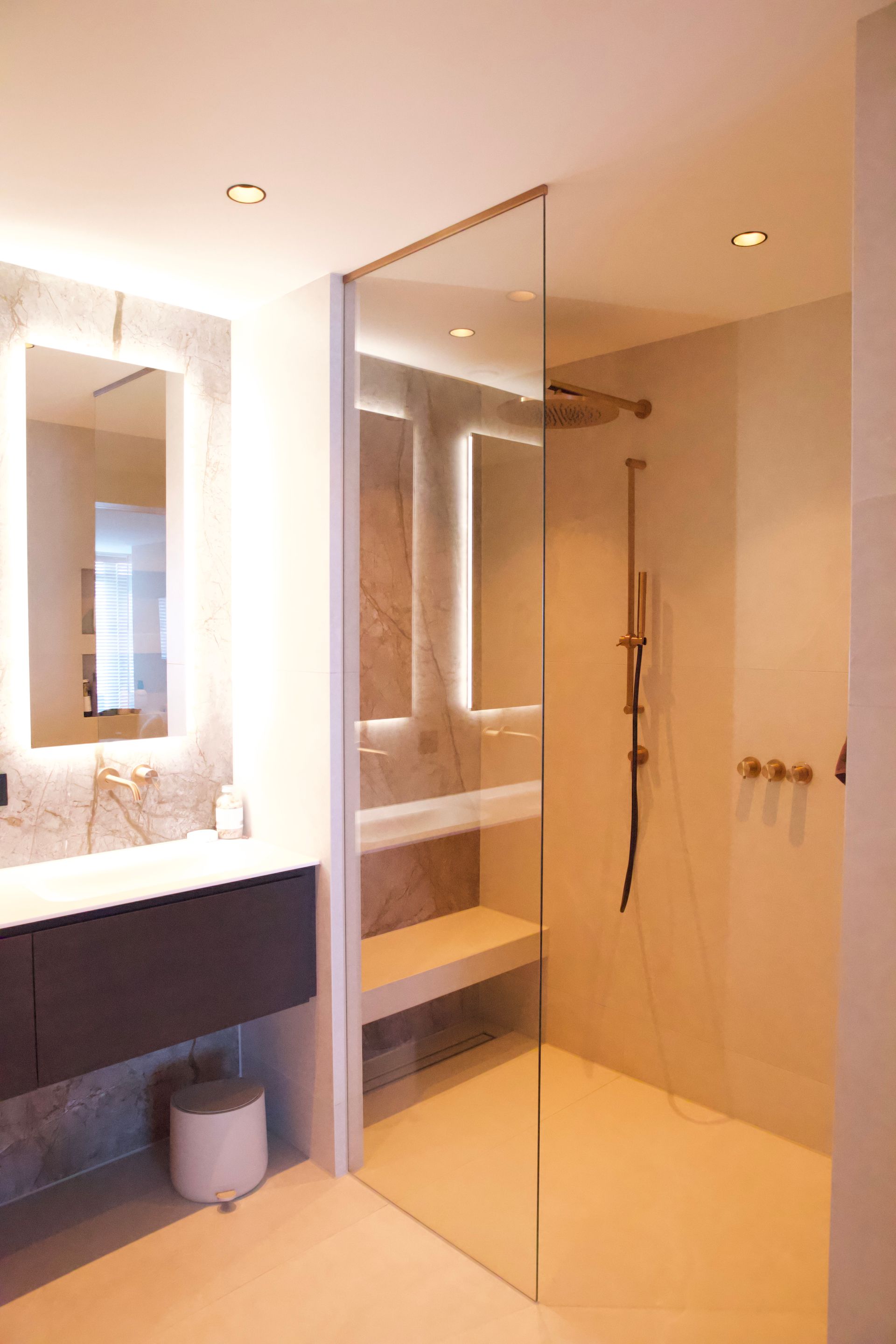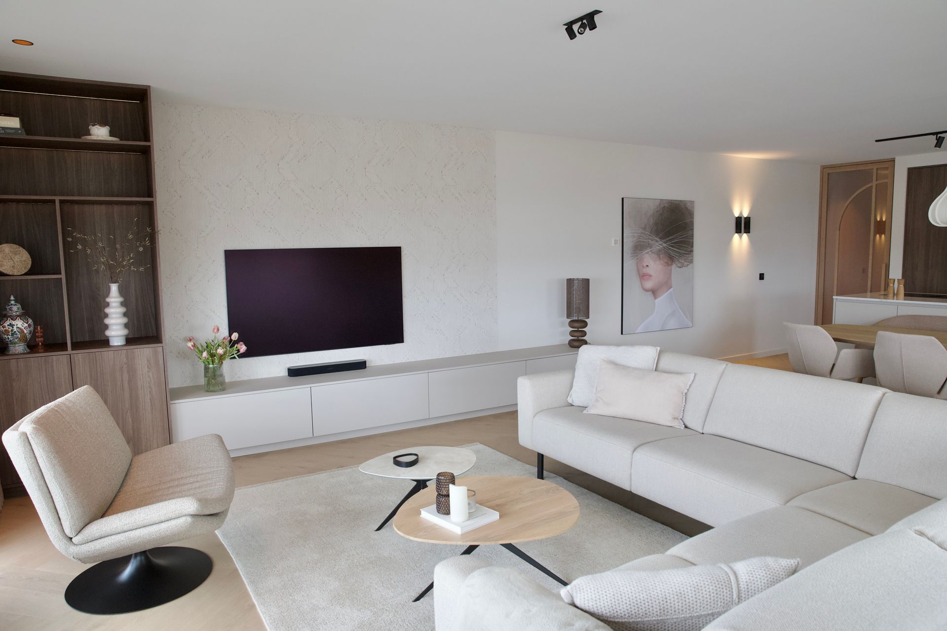 De wens van de bewoners was een licht, tijdloos en rustige inrichting. De woonkamer straalt verfijnde rust uit, met een keuken die luxe en functionaliteit moeiteloos combineert. De badkamer biedt een serene, spa-achtige ervaring. Door middel van een schuifdeur kom je uit in de slaapkamer. Deze vormt een stijlvolle plek om tot rust te komen, met oog voor comfort en detail. De inloopkast maakt het geheel compleet als een rustige, overzichtelijke ruimte waarin alles zijn eigen plek heeft.