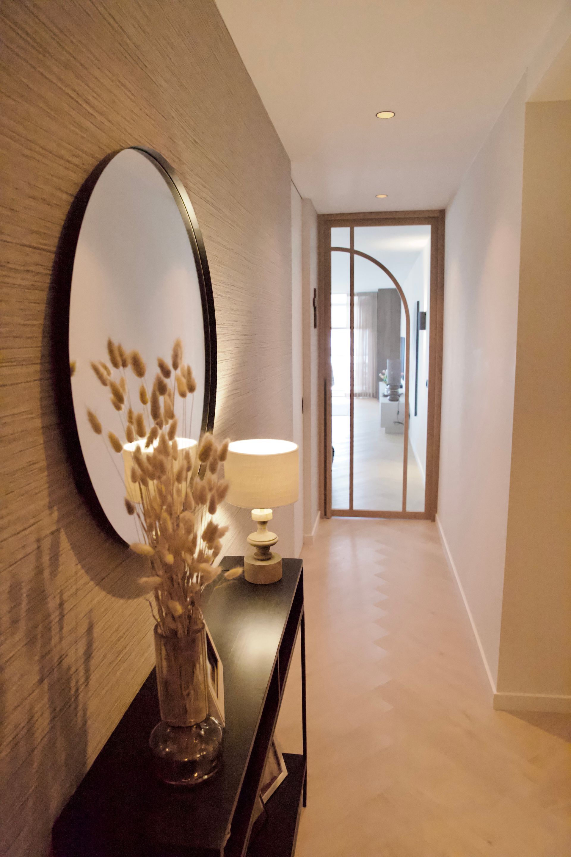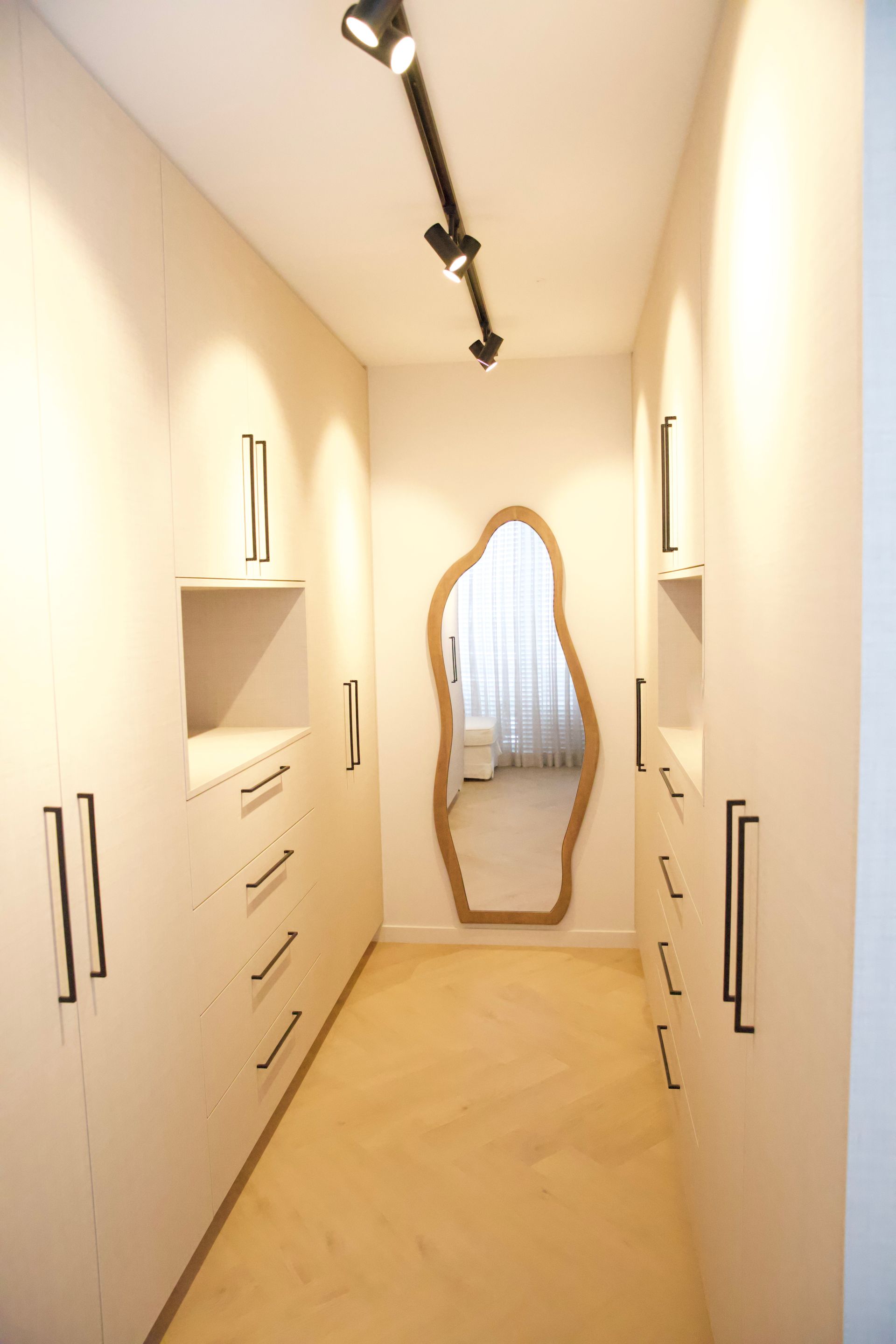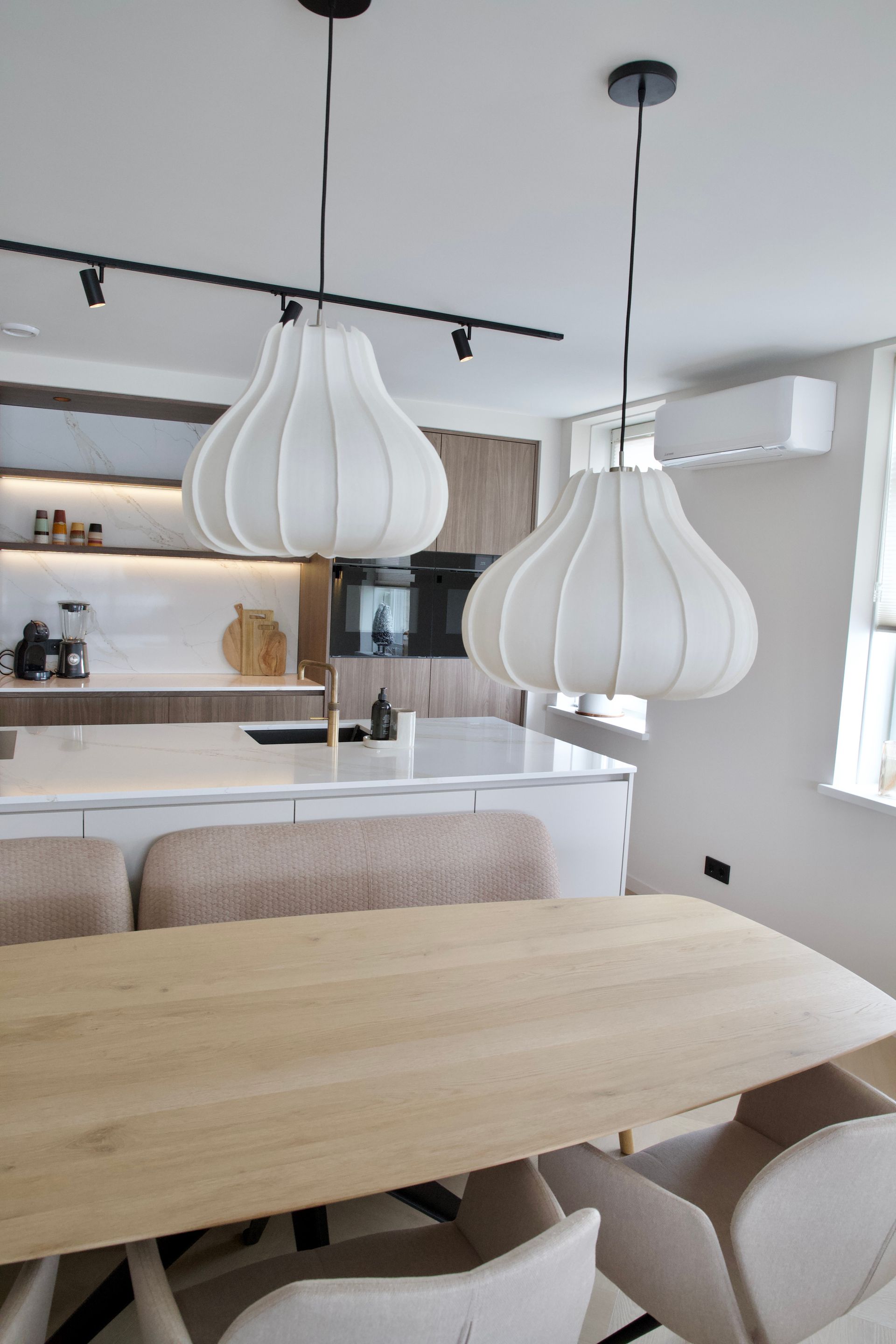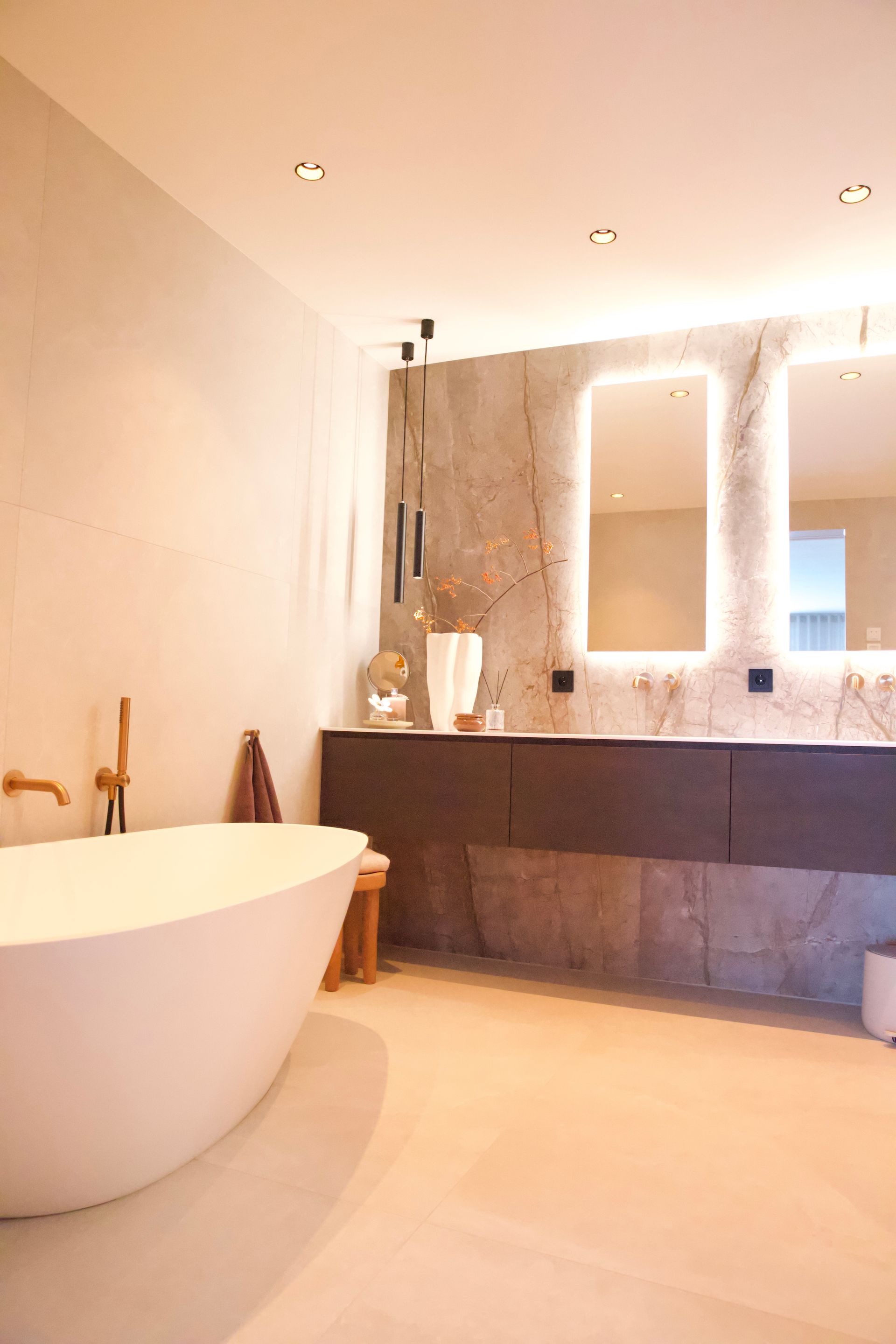 De wens van de bewoners was een licht, tijdloos en rustige inrichting. De woonkamer straalt verfijnde rust uit, met een keuken die luxe en functionaliteit moeiteloos combineert. De badkamer biedt een serene, spa-achtige ervaring. Door middel van een schuifdeur kom je uit in de slaapkamer. Deze vormt een stijlvolle plek om tot rust te komen, met oog voor comfort en detail. De inloopkast maakt het geheel compleet als een rustige, overzichtelijke ruimte waarin alles zijn eigen plek heeft.