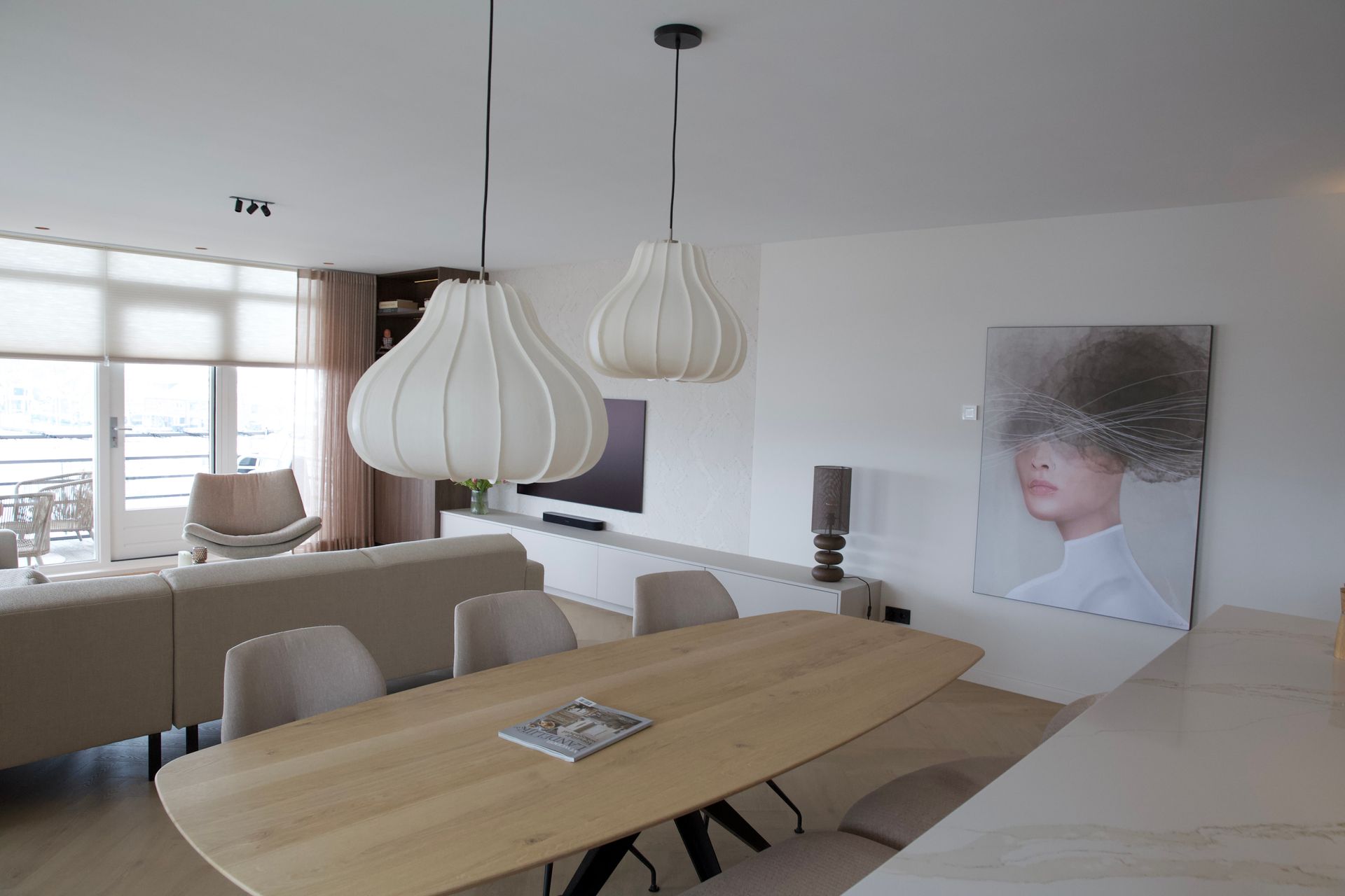 De wens voor deze woonkamer was een Scandinavisch interieur met kleur. Er werd me ook gevraagd mee te denken over de lange, kale muur. Ik heb gekozen voor een speelse posterwand, zodat dit bij binnenkomst gelijk een eyecatcher is. Er zijn nieuwe stalen deuren geplaatst voor meer lichtinval en om het geheel ruimtelijker te laten lijken. Om de akoestiek in de werkhoek te verbeteren zijn er houten latten met vilt bevestigd. Op de wand in de zithoek is een afgezwakte blauw/groene kleur geschilderd, deze is voorzien van ingelijste posters in kleurrijke tinten. De achterwand van de keuken is van een koraalkleur voorzien. Dit geeft ook weer warmte aan het geheel. Alle accessoires zijn in warme en koele tinten gecombineerd. Dit alles zorgt voor een verrassend resultaat.