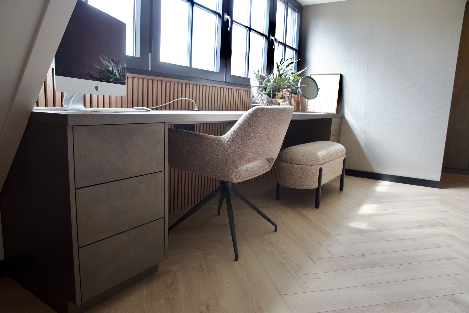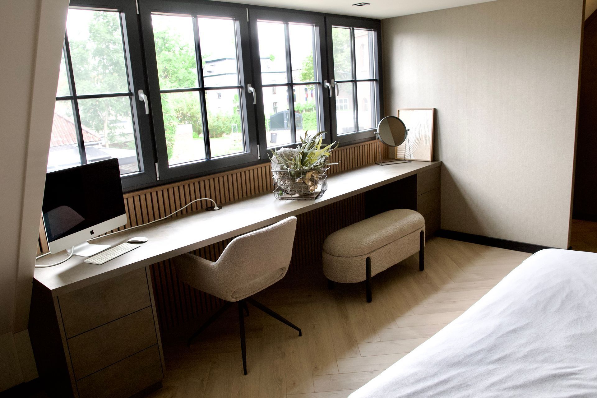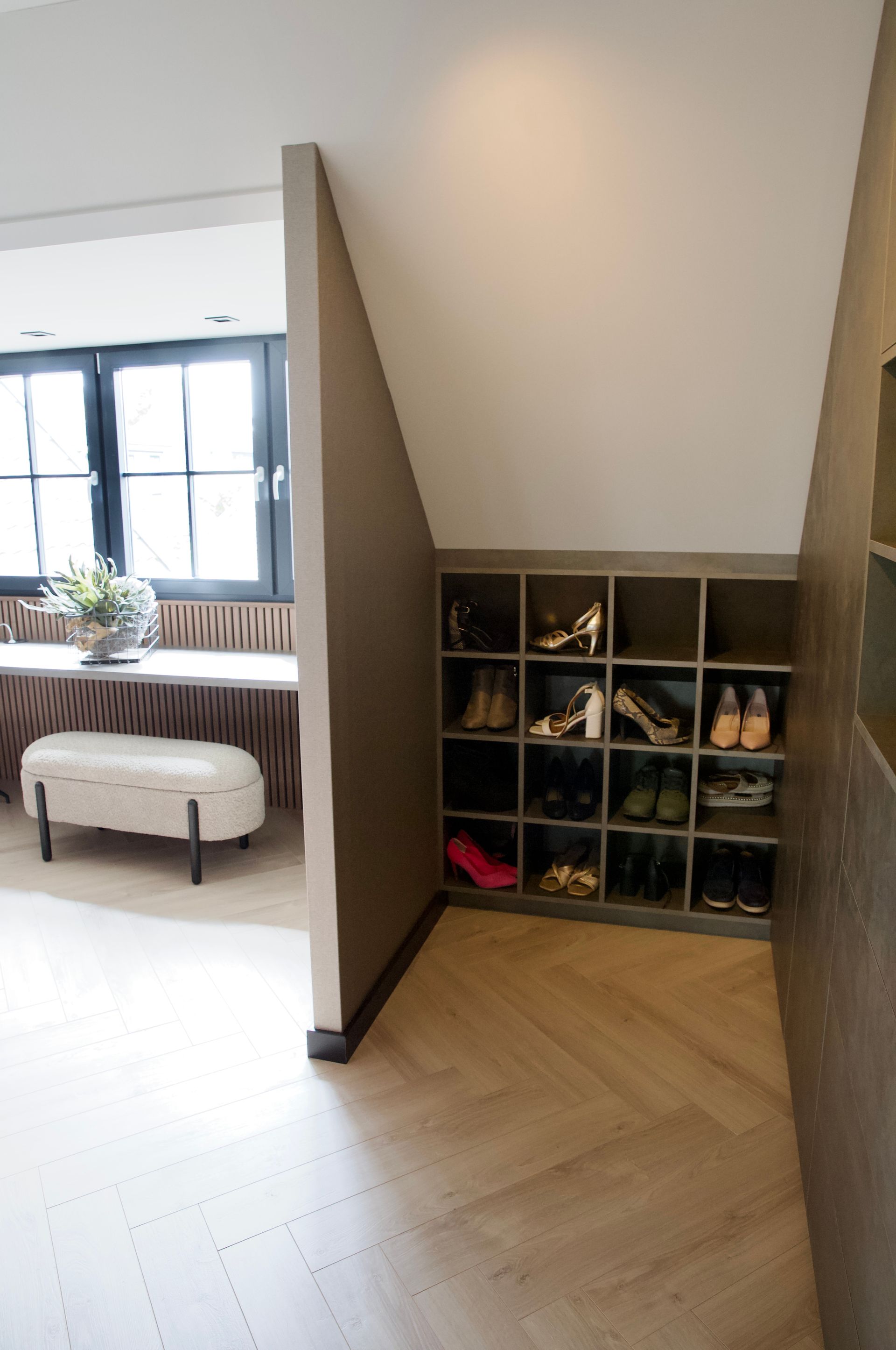 De bewoners hebben mij gevraagd mee te denken over een nieuwe indeling van de slaapkamer. Zij hadden als wens een ruime inloopkast met voldoende opbergruimte. Ook wilden zij graag een werkplek en een make-up hoekje met daglicht. Er is gekozen voor een dakkapel met een afmeting van maar liefst 3,5 meter breedte. Zo ontstond er veel meer daglicht, aangezien de slaapkamer eerst vrij donker was. Er zijn mooie materialen gebruikt zoals goud behang met een glinstering voor de hotel chique look, waar de bewoners van houden. Om de slaapkamer nog meer luxe te geven, is de inloopkast op maat gemaakt met als frontdeuren een leder-look. Een leuk detail is het doorkijkje naar de verzameling parfum in de inloopkast. Het is een mooie ruimtelijke, tijdloze slaapkamer geworden met een prachtige luxe uitstraling.