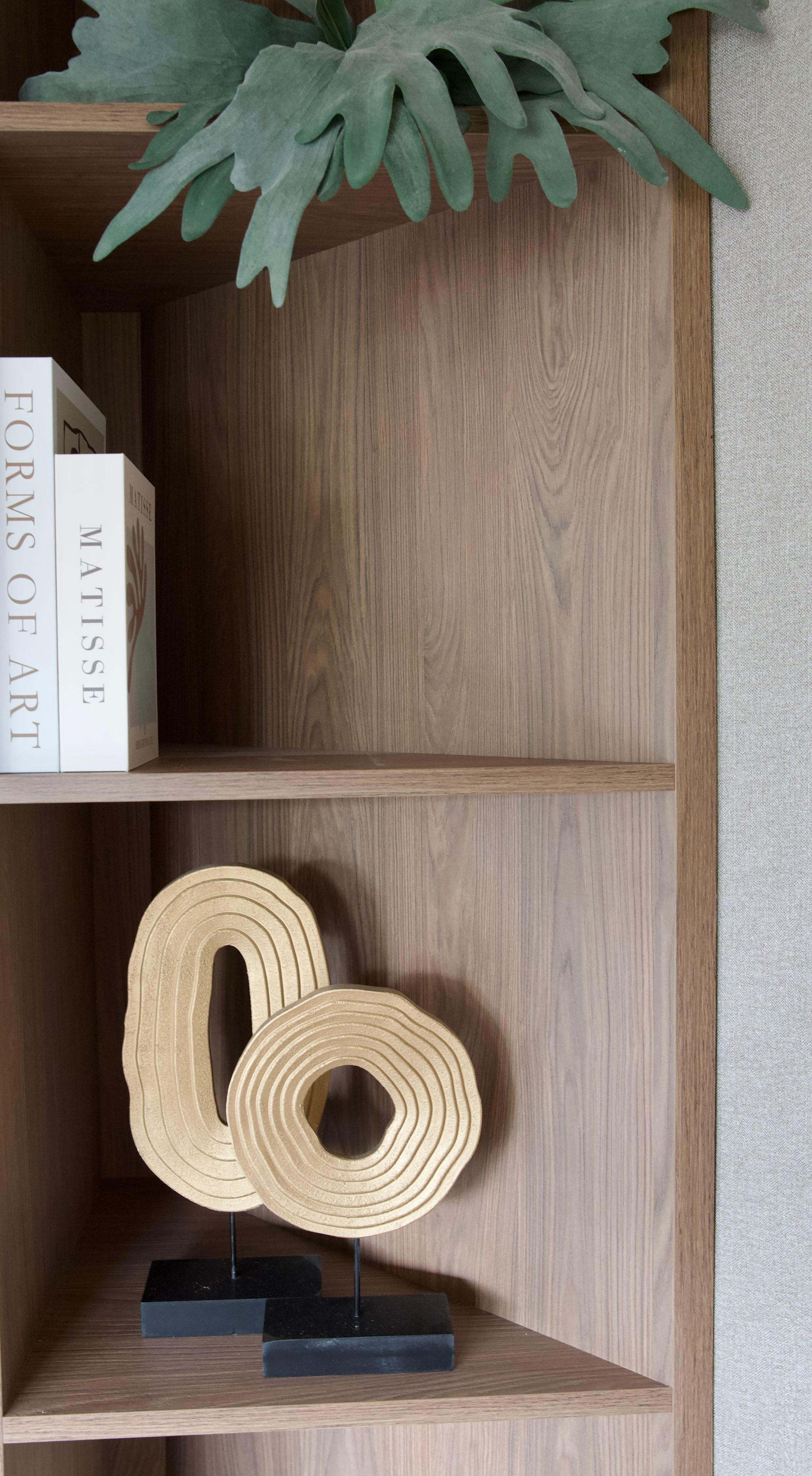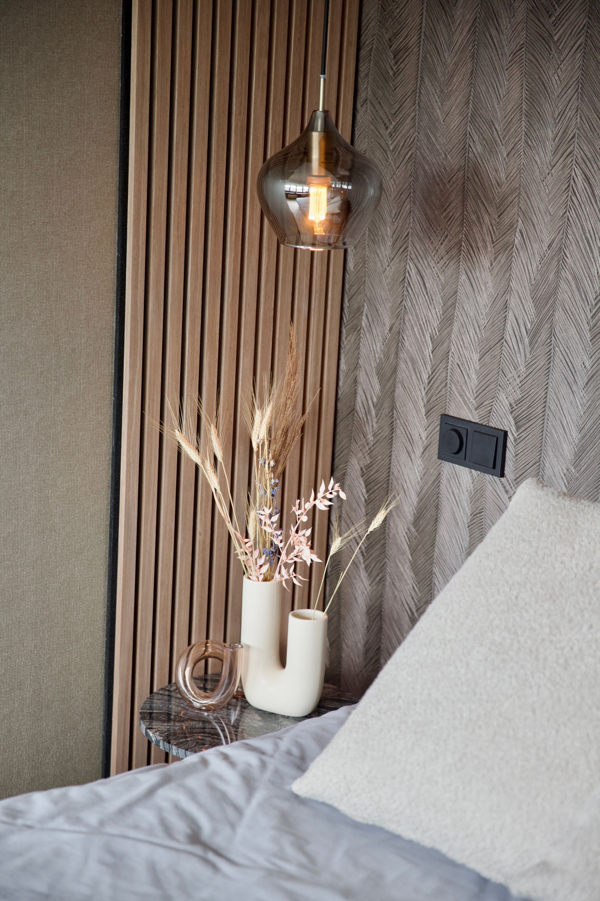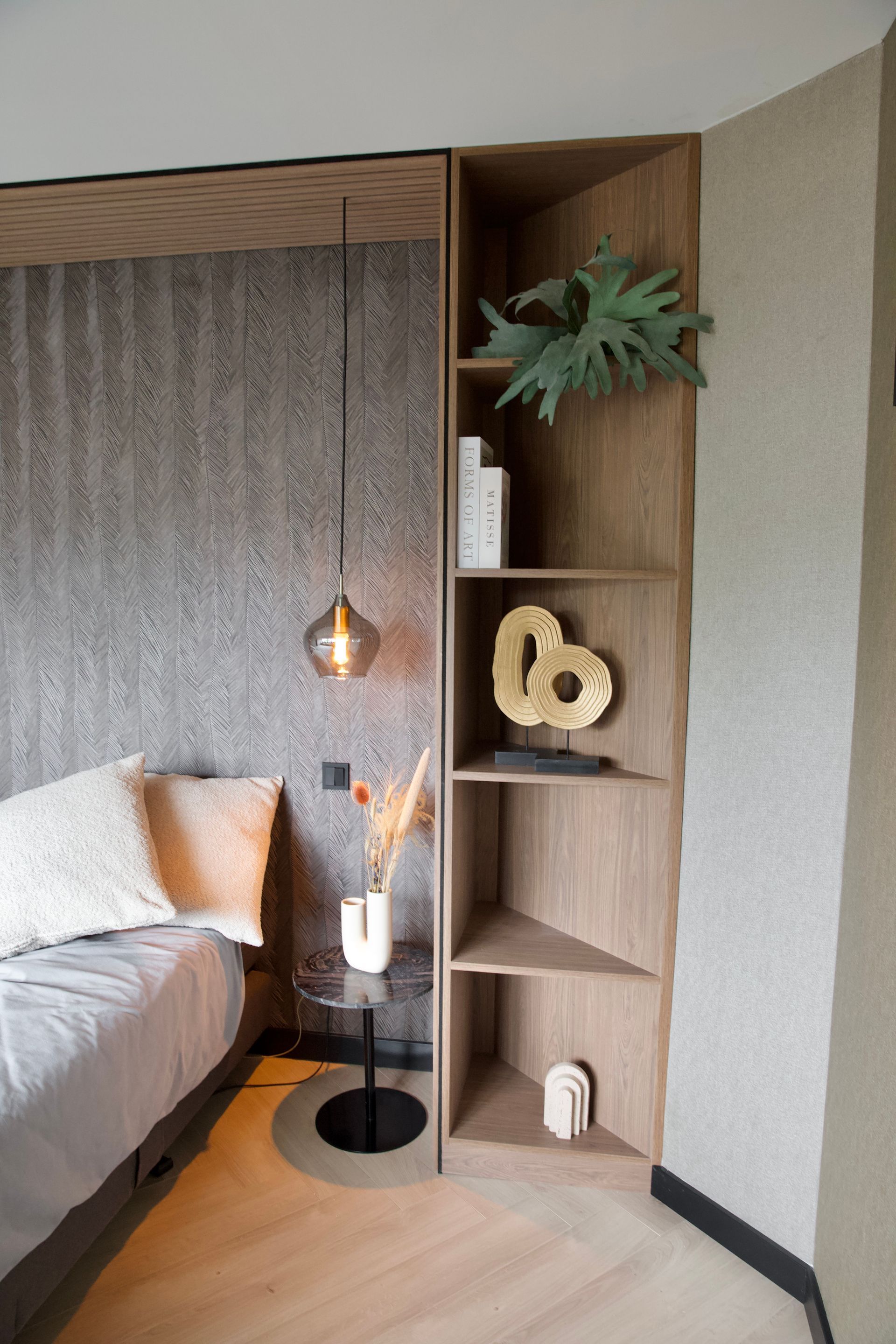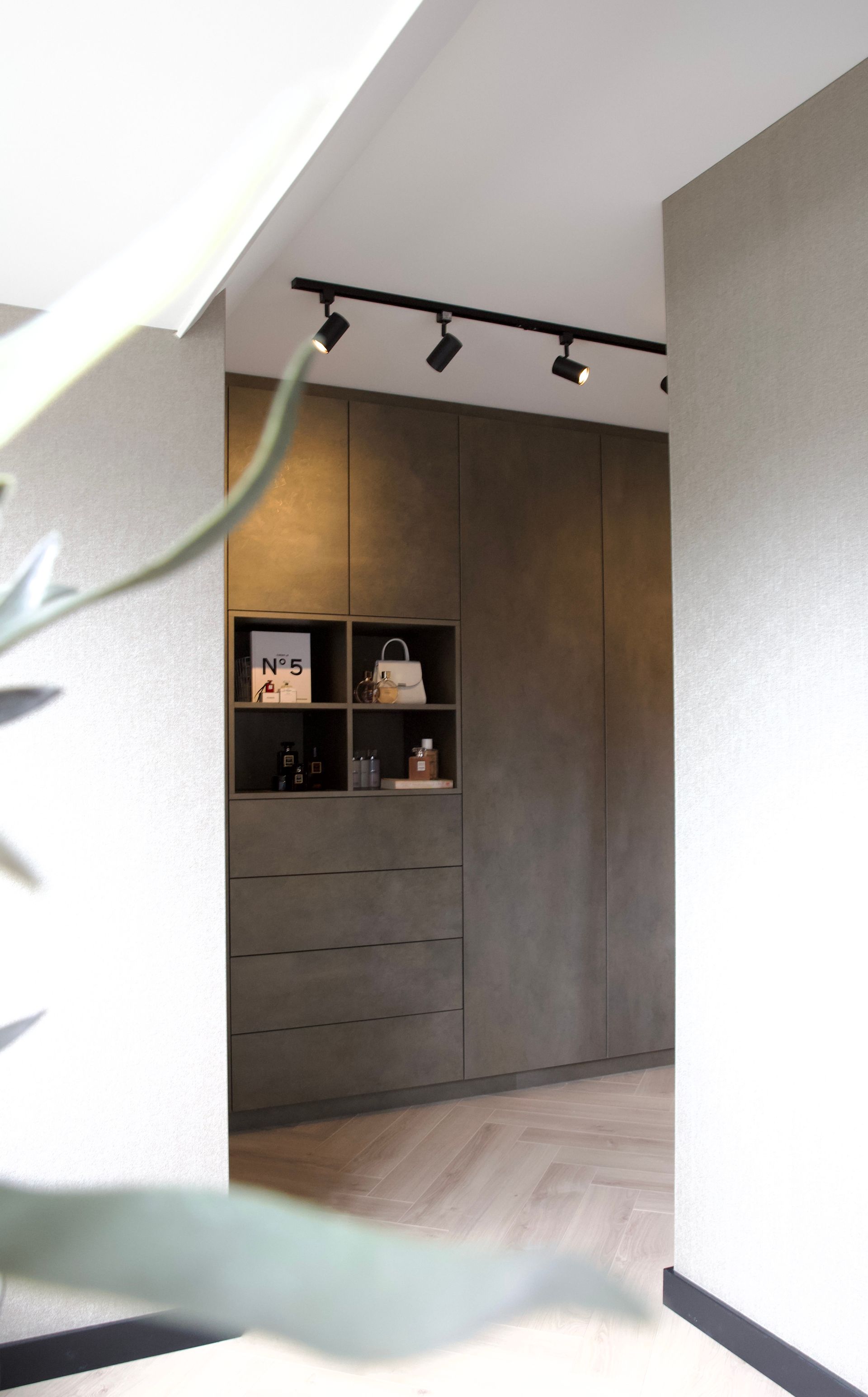 De bewoners hebben mij gevraagd mee te denken over een nieuwe indeling van de slaapkamer. Zij hadden als wens een ruime inloopkast met voldoende opbergruimte. Ook wilden zij graag een werkplek en een make-up hoekje met daglicht. Er is gekozen voor een dakkapel met een afmeting van maar liefst 3,5 meter breedte. Zo ontstond er veel meer daglicht, aangezien de slaapkamer eerst vrij donker was. Er zijn mooie materialen gebruikt zoals goud behang met een glinstering voor de hotel chique look, waar de bewoners van houden. Om de slaapkamer nog meer luxe te geven, is de inloopkast op maat gemaakt met als frontdeuren een leder-look. Een leuk detail is het doorkijkje naar de verzameling parfum in de inloopkast. Het is een mooie ruimtelijke, tijdloze slaapkamer geworden met een prachtige luxe uitstraling.