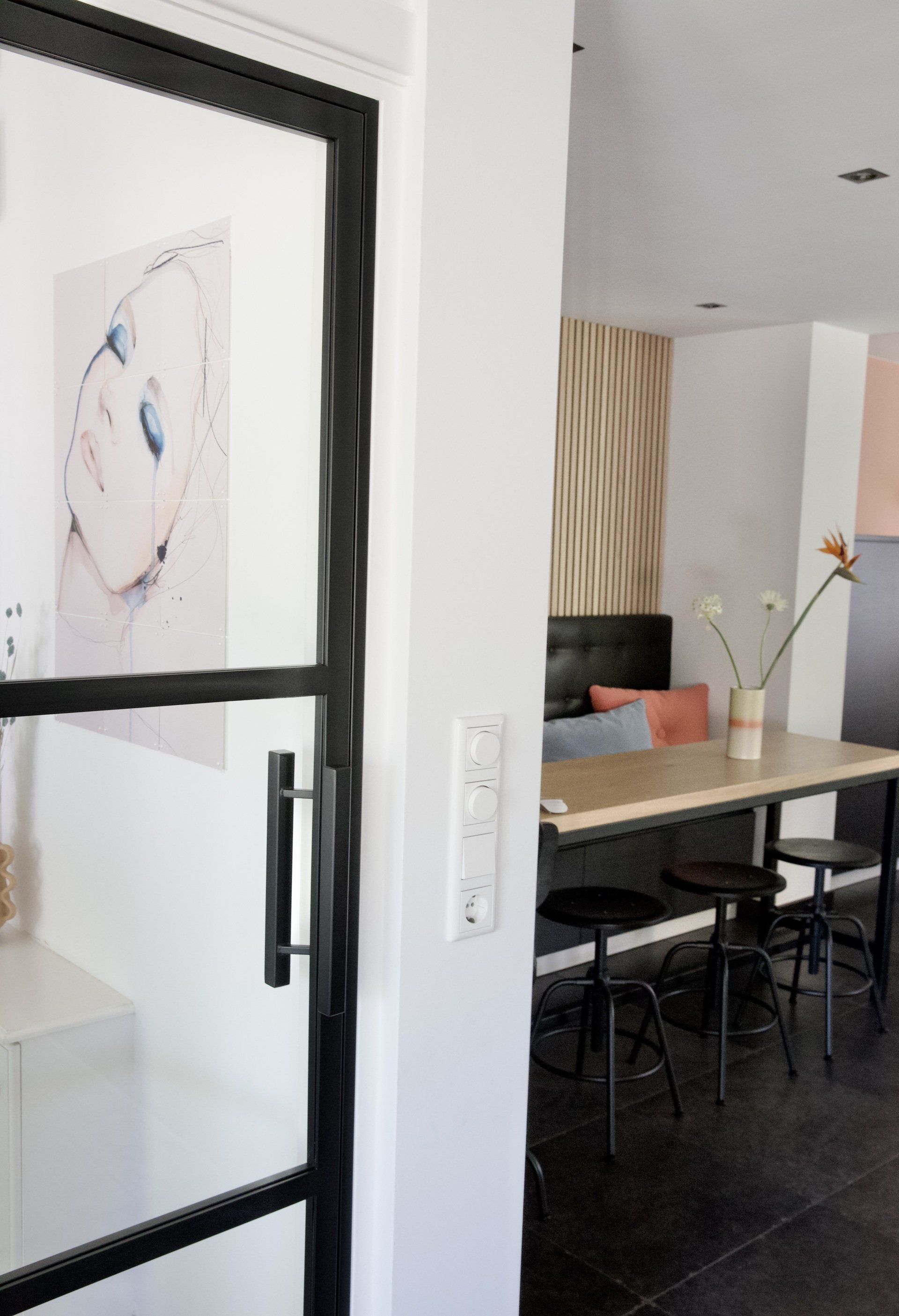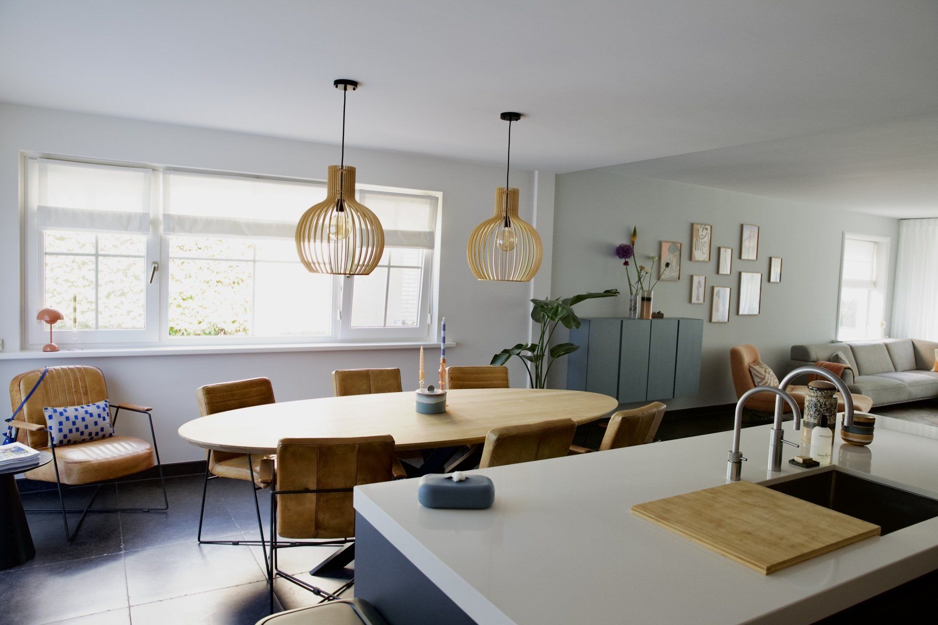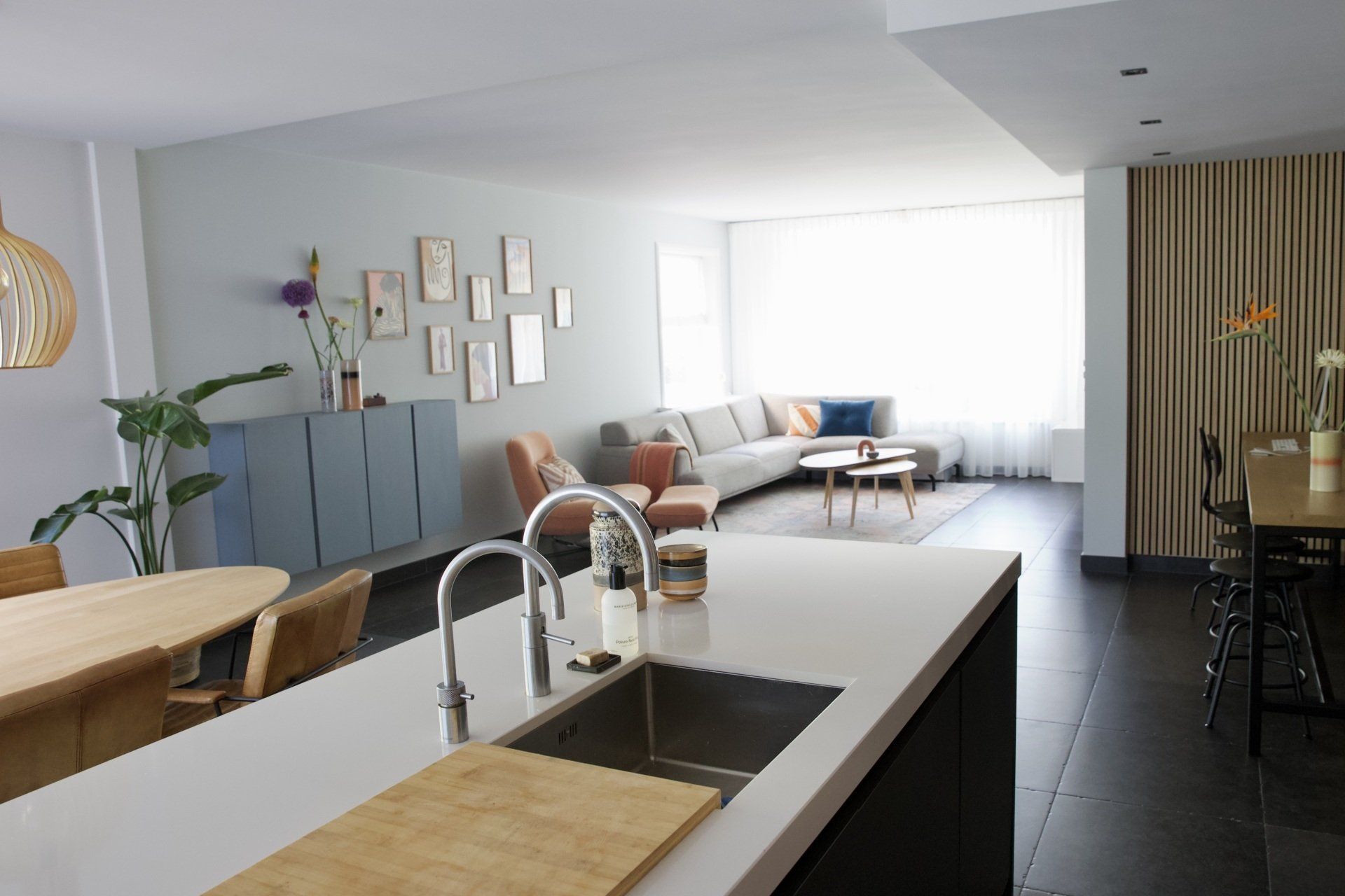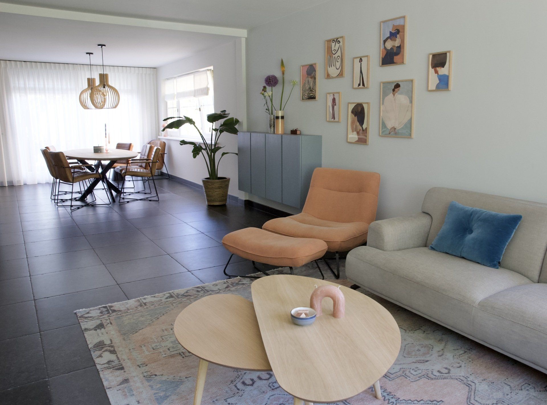 De wens voor deze woonkamer was een Scandinavisch interieur met kleur. Er werd me ook gevraagd mee te denken over de lange, kale muur. Ik heb gekozen voor een speelse posterwand, zodat dit bij binnenkomst gelijk een eyecatcher is. Er zijn nieuwe stalen deuren geplaatst voor meer lichtinval en om het geheel ruimtelijker te laten lijken. Om de akoestiek in de werkhoek te verbeteren zijn er houten latten met vilt bevestigd. Op de wand in de zithoek is een afgezwakte blauw/groene kleur geschilderd, deze is voorzien van ingelijste posters in kleurrijke tinten. De achterwand van de keuken is van een koraalkleur voorzien. Dit geeft ook weer warmte aan het geheel. Alle accessoires zijn in warme en koele tinten gecombineerd. Dit alles zorgt voor een verrassend resultaat.