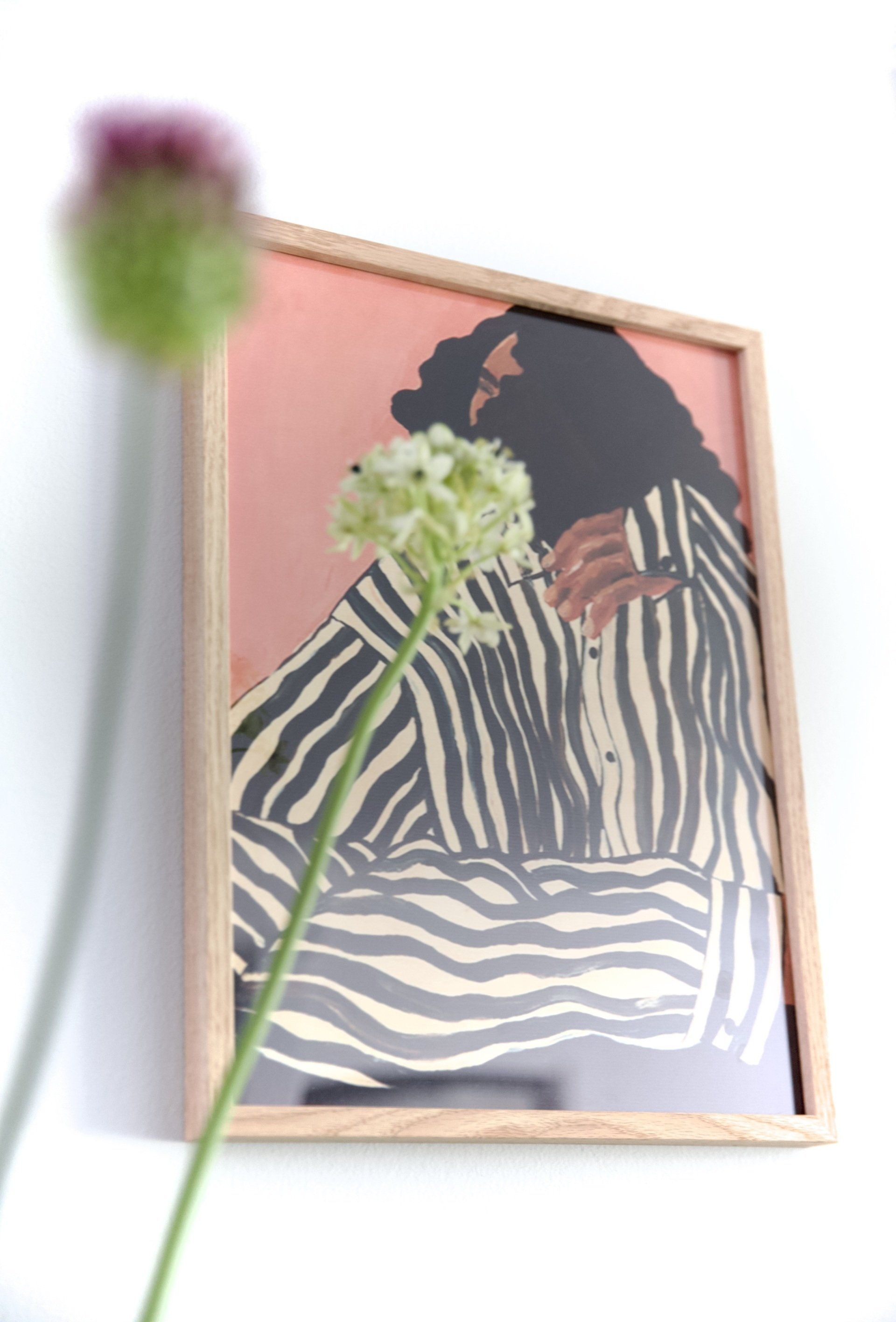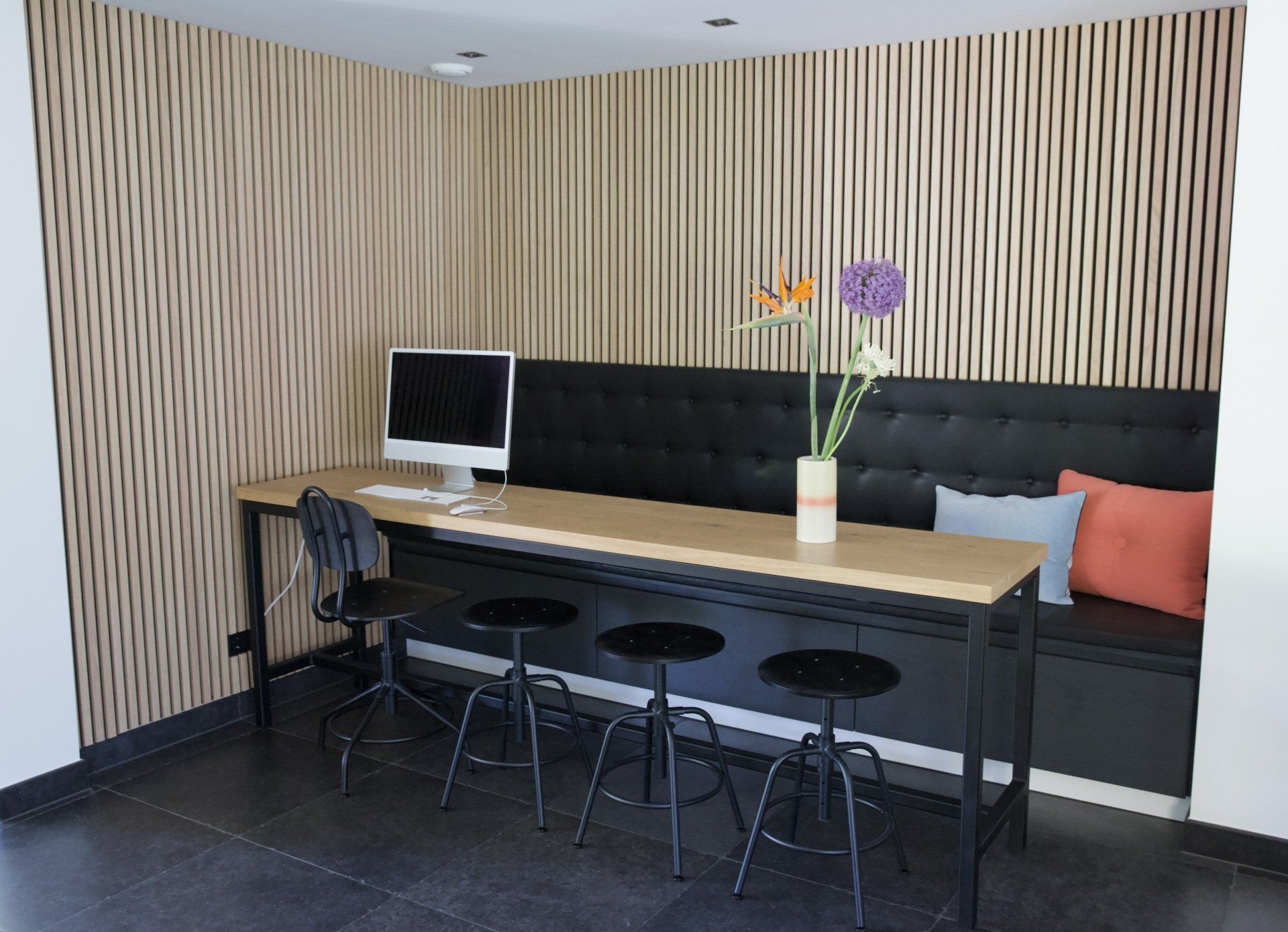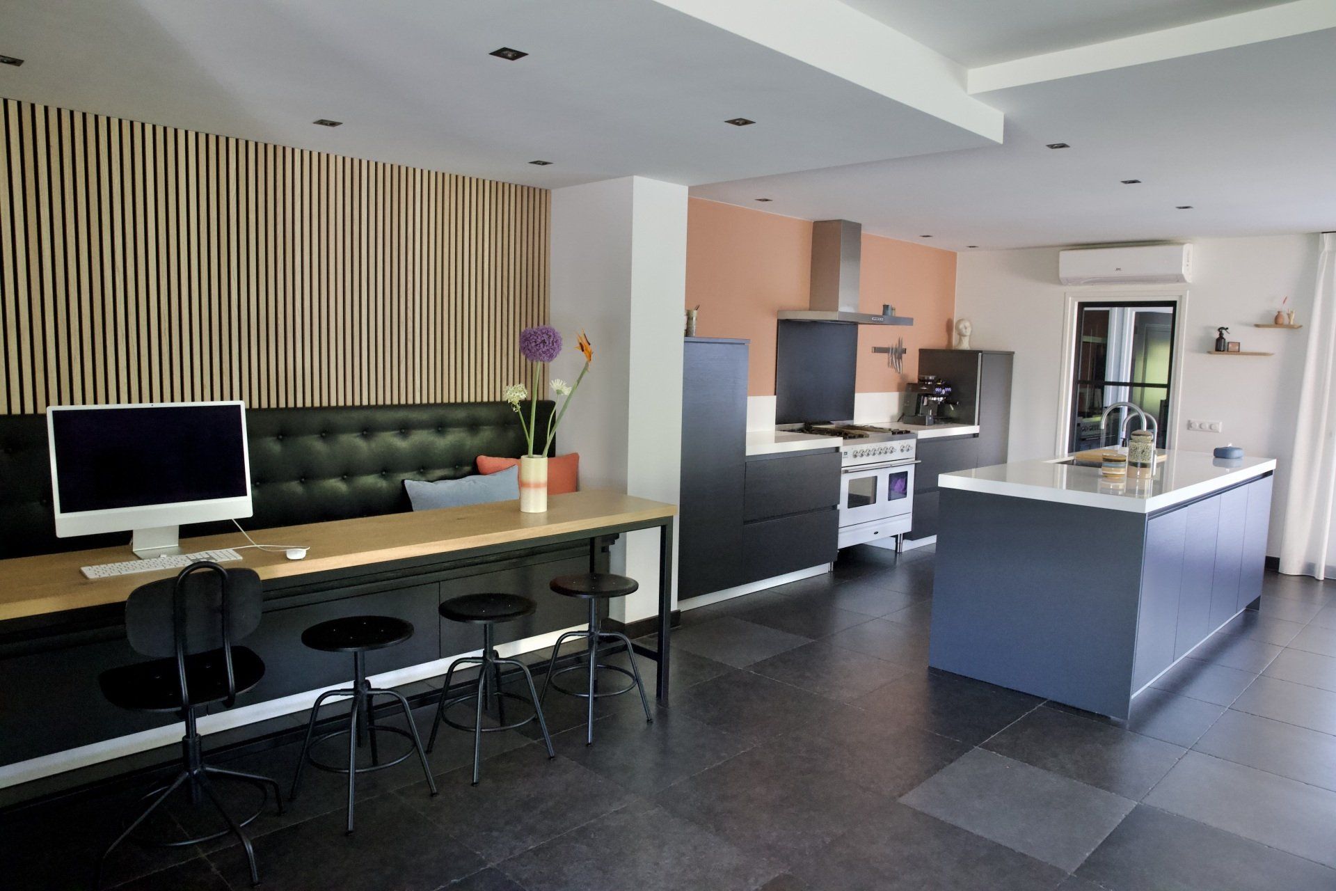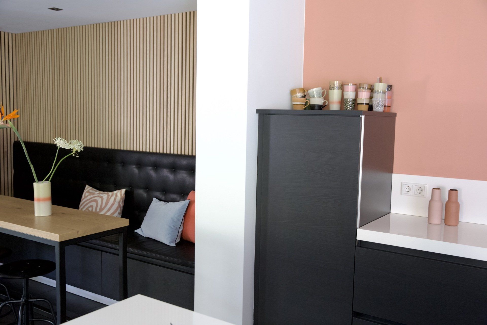 De wens voor deze woonkamer was een Scandinavisch interieur met kleur. Er werd me ook gevraagd mee te denken over de lange, kale muur. Ik heb gekozen voor een speelse posterwand, zodat dit bij binnenkomst gelijk een eyecatcher is. Er zijn nieuwe stalen deuren geplaatst voor meer lichtinval en om het geheel ruimtelijker te laten lijken. Om de akoestiek in de werkhoek te verbeteren zijn er houten latten met vilt bevestigd. Op de wand in de zithoek is een afgezwakte blauw/groene kleur geschilderd, deze is voorzien van ingelijste posters in kleurrijke tinten. De achterwand van de keuken is van een koraalkleur voorzien. Dit geeft ook weer warmte aan het geheel. Alle accessoires zijn in warme en koele tinten gecombineerd. Dit alles zorgt voor een verrassend resultaat.